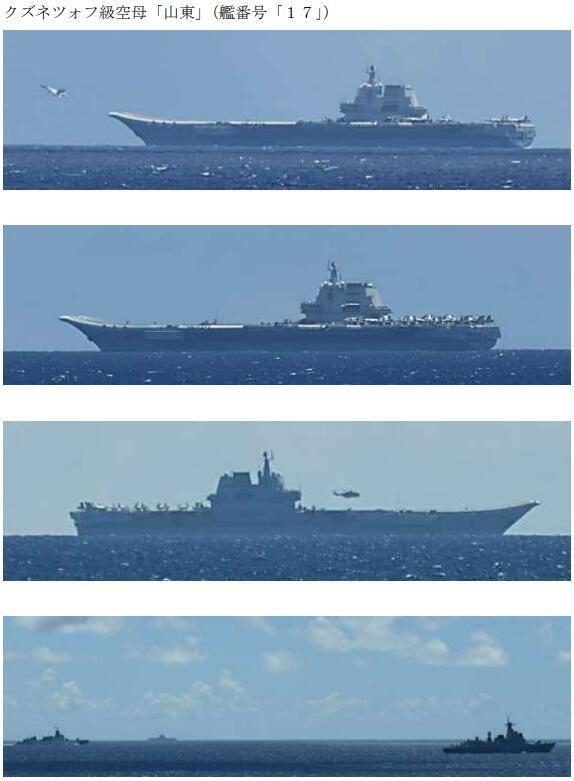 香港新聞網7月10日電 日本防衛省統合幕僚監部(聯合參謀部)昨日(9日)發佈一則“中國海軍艦艇動向”通報,通報中稱,當地時間7月9日上午7時(北京時間早6時)許,日本海上自衛隊在宮古島東南方約520千米處的太平洋海域,確認到了由山東號航空母艦、1艘055型導彈驅逐艦(106延安艦)、1艘052D型導彈驅逐艦(164桂林艦)和1艘054A型導彈護衛艦(571運城艦)共計4艘艦艇所組成的中國海軍艦艇編隊。 此外,通報還提到,當天確認到了山東艦上有艦載戰鬥機和艦載直升機的起降活動。