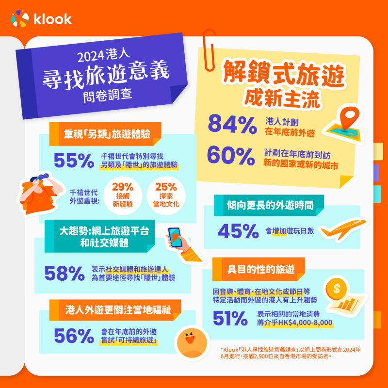 (香港新聞網製圖) 據Klook調查顯示,千禧世代大多踏入職場一段時間,有着一定經濟基礎,並對旅遊和玩樂甚為熱衷,因此最有能力和動機嘗試新的旅遊地點、方式和體驗。多於一半(55%)千禧世代港人表示會在外遊時特別尋找另類甚至“隱世”的旅遊體驗,比例為不同年齡層當中最高。 尋覓、發掘和解鎖嶄新的外遊景點和體驗將會是2024年下半年的主調。多於八成(84%)受訪港人有計劃在年底前外遊,當中每五位受訪者,便有三位(60%)表示將會跳出自己的外遊舒適圈,主動計劃到過往未曾遊覽的地方,包括新的國家或新的城市。 而為了有更多時間探索新的地點及嘗試更新穎的體驗,港人每次外遊的平均日數亦將增加,並透過社交媒體和旅遊達人尋找這些另類體驗。整體而言,和過去一年的外遊相比,近半數(45%)受訪者表示接下來在年底前的旅程將會增加旅遊日數,當中以千禧世代(44%)和Z世代(47%)的比例為最高。(註:Z世代通常指1995年至2009年出生的一代人,他們一出生就與網絡時代無縫對接,受數字信息技術、即時通信設備、智能手機產品等影響比較大。)