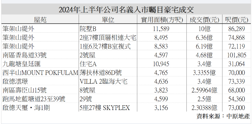 中原地產數據。 據中原地產亞太區副主席兼住宅部總裁陳永傑稱,富人愛用公司名義買豪宅,今年全港73宗超級豪宅(樓價1億元以上)成交之中,有近半買家以公司名義入市,其中筆架山緹外一幢別墅在撤辣後,以10億元賣出,呎價及總價均為九龍區歷史新高,買家以英屬處女島(BVI)公司名義購入,成為今年全港最大宗公司客入市個案。