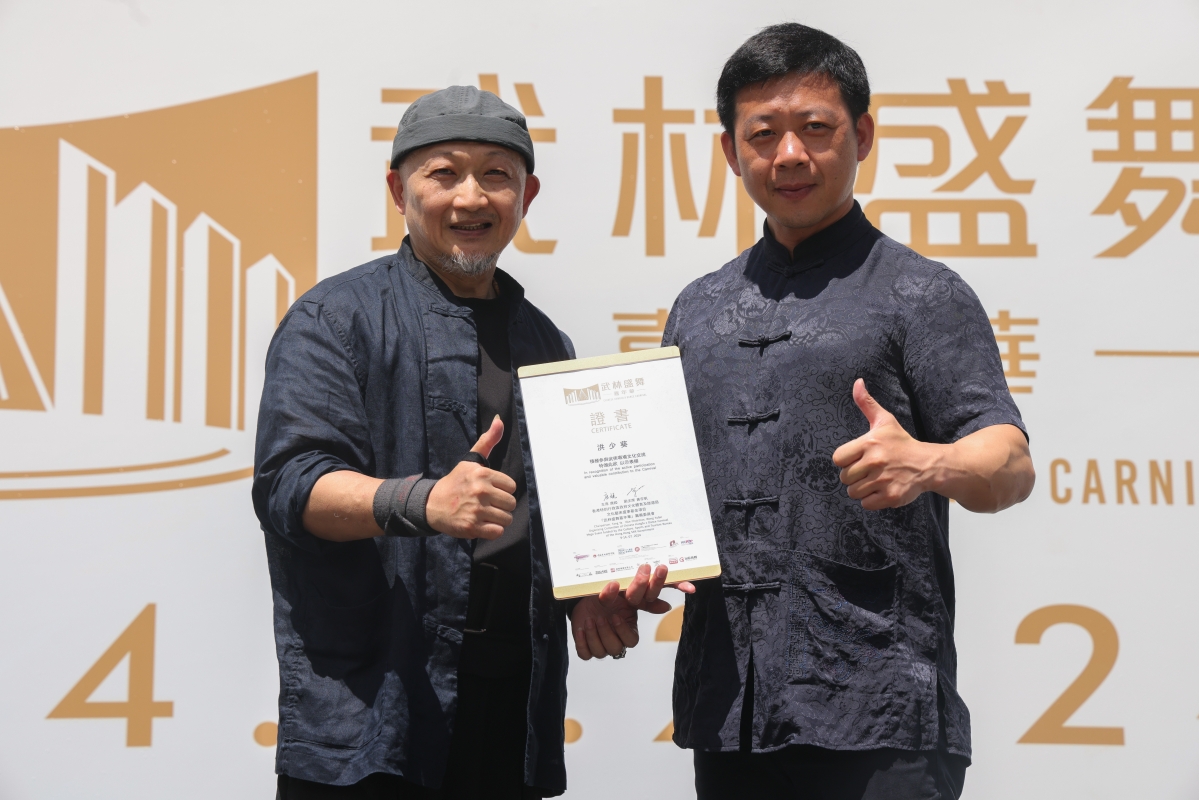 中國武術國際學院院長黃宇帆(右)頒發證書給專場領隊洪少葵師傅