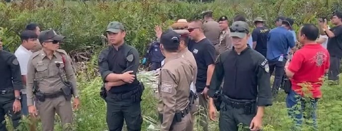 泰國警方在荒郊進行搜查。圖自泰媒 泰國警方初步判斷失蹤女子可能已經被殺害。當地時間13日中午12時左右,泰國曼谷大都會警局副局長諾帕辛帶領相關部門機構人員,一同前去北柳府府治縣Bang Phra地區某村莊附近的荒野郊區進行搜尋,此前調查人員在這一帶聞到可疑氣味。