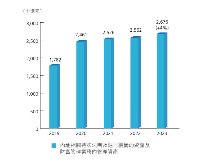 (來源:香港證監會報告截圖) 基金類型方面,開放式基金型公司的強勁增長勢頭延續,獲註册的開放式基金型公司的數目較2022年增加118%,顯示資產管理公司繼續善用香港的公司型基金結構及相關政府資助。 內地相關機構資產及財富管理業在港管理資產增長4% 報告還顯示,內地相關機構繼續擴大其於香港的版圖。 香港證監會數據顯示,內地相關持牌法團及註册機構的資產及財富管理業務的管理資產按年增長4%至26760億港元,并錄得1530億港元的淨資金流入,較2022年上昇16%。這些持牌法團及註册機構的管理資產呈增長趨勢,自2019年起的增幅為50%。