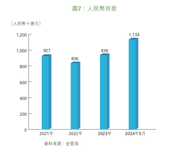 (來源:香港證監會報告截圖) 內地註册機構數量和從業人員方面也有增長。報告顯示,在香港從事資產及財富管理業務的內地相關持牌法團及註册機構有149家,其從業員人數按年增加2%。自2019年起,從事資產及財富管理業務的內地相關持牌法團及註册機構的數目增加了33%,其從業員人數亦於同期增加38%。 此外,內地相關持牌法團及註册機構的資產管理及基金顧問業務按年增長6%至21820億港元。 香港作為卓越的人民幣離岸中心地位穩固 報告顯示,香港作為卓越的人民幣離岸中心,一直提供廣泛的人民幣金融產品及流動性充裕的人民幣生態系統。 香港金融管理局數據顯示,香港擁有全球最大的離岸人民幣存款資金池,在所有離岸人民幣存款中占逾半數,而有關部分於2024年5月的總數為人民幣11340億元。 香港亦一直是首要的離岸人民幣結算樞紐,處理全球約80%的人民幣支付。充足的流動性為香港離岸人民幣債券(亦稱點心債券)的發展提供所需支持。2023年,在香港發行的離岸人民幣債務證券按年增加18.2%至人民幣7858億元。