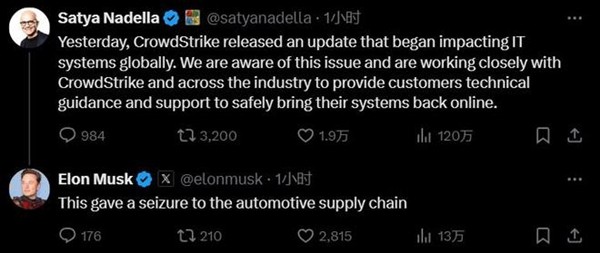 微軟CEO納德拉回應。 納德拉表示微軟正在與CrowdStrike進行密切合作,向受影響客戶提供技術支持,然而生氣的馬斯克毫不留情地回復稱,你們搞出來的事情對汽車供應鏈造成了衝擊。(完) 【編輯:錢林霞】