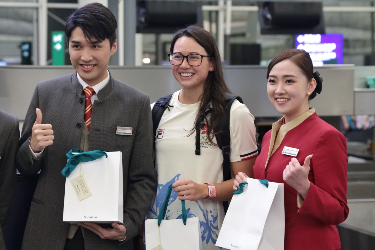 游泳選手何詩蓓(中)與國泰航空工作人員合影