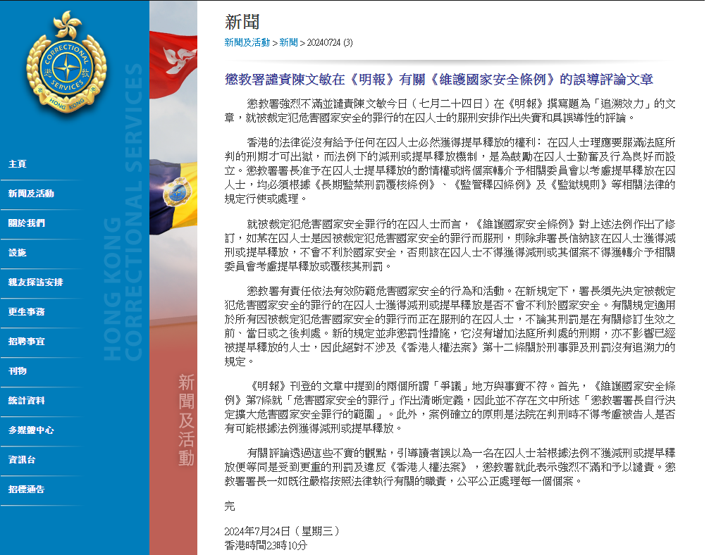香港新聞網7月25日電 香港特區政府懲教署強烈不滿並譴責陳文敏24日在《明報》撰寫題為《追溯效力》的文章,就被裁定犯危害國家安全的罪行的在囚人士的服刑安排作出失實和具誤導性的評論。 懲教署表示,香港的法律從沒有給予任何在囚人士必然獲得提早釋放的權利:在囚人士理應要服滿法庭所判的刑期才可出獄,而法例下的減刑或提早釋放機制,是為鼓勵在囚人士勤奮及行為良好而設立。懲教署署長准予在囚人士提早釋放的酌情權或將個案轉介予相關委員會以考慮提早釋放在囚人士,均必須根據《長期監禁刑罰覆核條例》《監管釋囚條例》及《監獄規則》等相關法律的規定行使或處理。