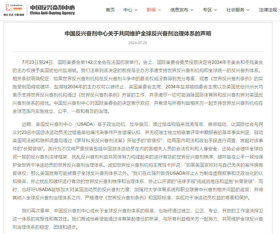中國反興奮劑中心官網截圖 中國反興奮劑中心在聲明中說:“近期,美國反興奮劑中心(USADA)基於政治動機、反華偏見,通過捏造構陷來混淆是非、蠱惑煽動,讓國際社會與民眾對23名中國游泳運動員無過錯曲美他嗪污染事件產生錯誤認知,並無視瑞士獨立檢察官評審中期報告的基本事實判定,鼓動美國司法部和聯邦調查局通過《羅琴科夫反興奮劑法》所賦予的‘管轄權’,動用國內司法和政治手段進行調查,發起對該事件的‘長臂管轄’。該行為不僅將嚴重損害包括中國游泳運動員在內的各相關人員的合法權利和人身安全,還勢必會破壞全球協調一致的反興奮劑法律框架,擾亂反興奮劑利益共同體努力構建起來的運行有效的世界反興奮劑秩序,破壞旨在公平一致地保護全世界乾淨運動員的世界反興奮劑治理體系。” 中心敦促USADA停止人為製造虛假敘事和泛政治化的認知操弄,停止擾亂和破壞運行有效的世界反興奮劑秩序和治理體系,停止以所謂的“法律手段”搞威脅施壓和濫施“長臂管轄”;同時,也呼籲USADA能夠加大對美國運動員反興奮劑工作的力度,加強對大學體育系統和職業聯賽中興奮劑相關問題的監管,並將其納入全球反興奮劑治理體系之內,嚴格遵守《世界反興奮劑條例》和國際標準,實現對乾淨運動員權益的尊重和保護。 “我們再次重申,中國反興奮劑中心成長於全球反興奮劑體系的根基,也始終通過獨立、公正、專業、開放的工作堅決捍衛這一體系的完整性和有效性。我們真誠地希望能通過體育架起信任的橋樑,與所有利益相關方一起努力,共同維護全球反興奮劑治理體系的穩定、團結和進步。”聲明中說。(完) 【編輯:丘志彬】
