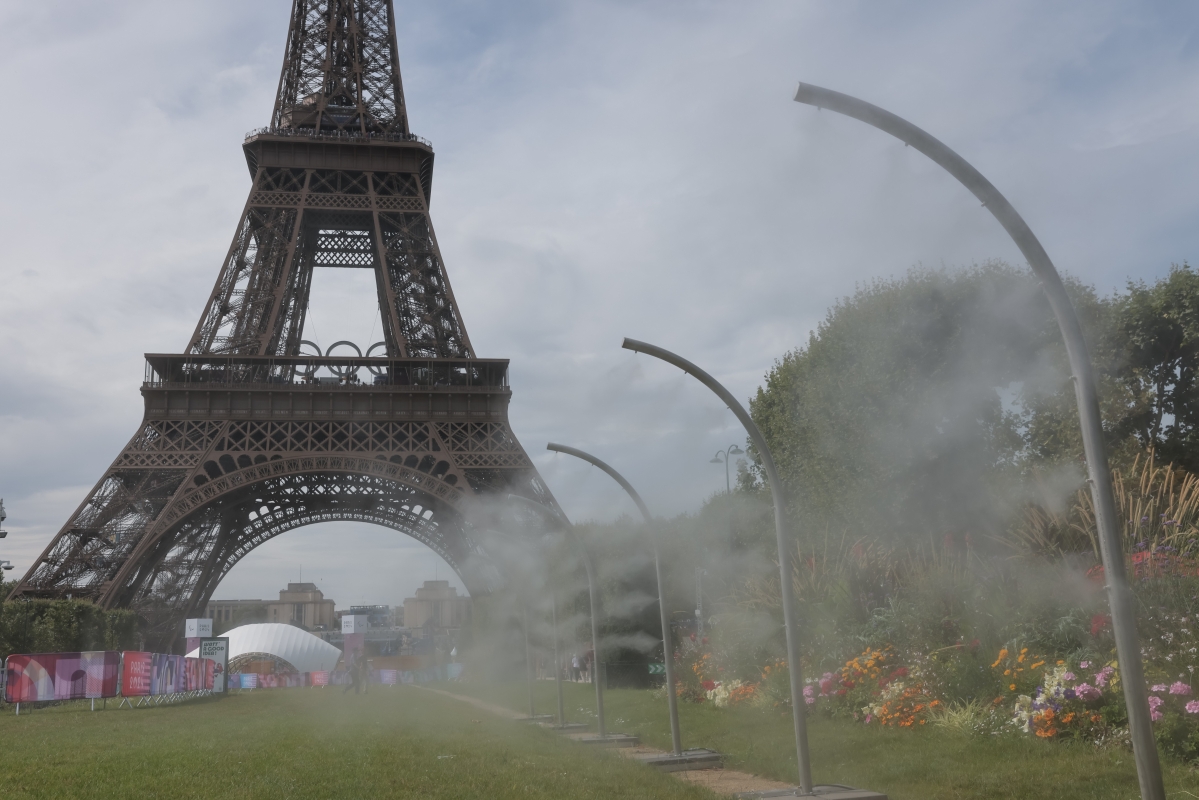 天氣炎熱,埃菲爾鐵塔體育場內噴水霧降溫