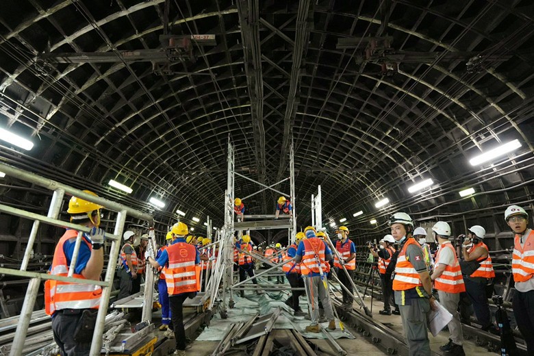 香港新聞網7月28日電 港鐵表示,今日(28日)將進行觀塘綫隧道大型基建設施更新工程,凌晨觀塘綫收車後,工程人員隨即展開工程,包括為相關隧道路段隔離電源及安排保護措施,由工程車運送物料到施工位置,再搭建多組金屬棚架,將以分段形式更換油麻地站附近交叉渡綫隧道頂用作懸掛電纜的大型金屬吊架,更換吊架期間,工程人員需移除及重置部分電纜及架空天綫。工程人員現正全力推進工程。