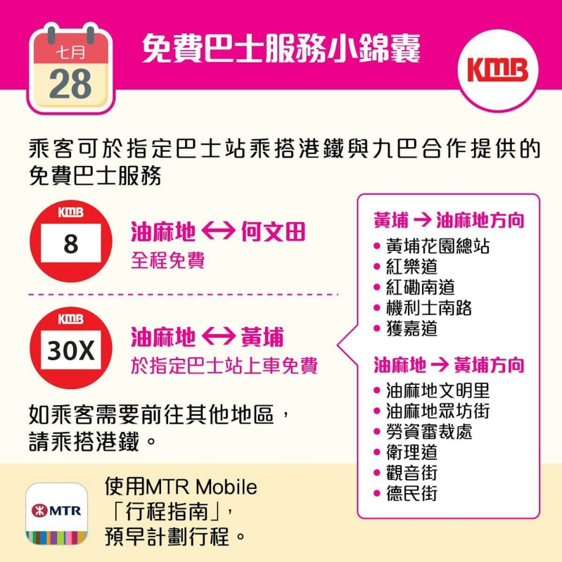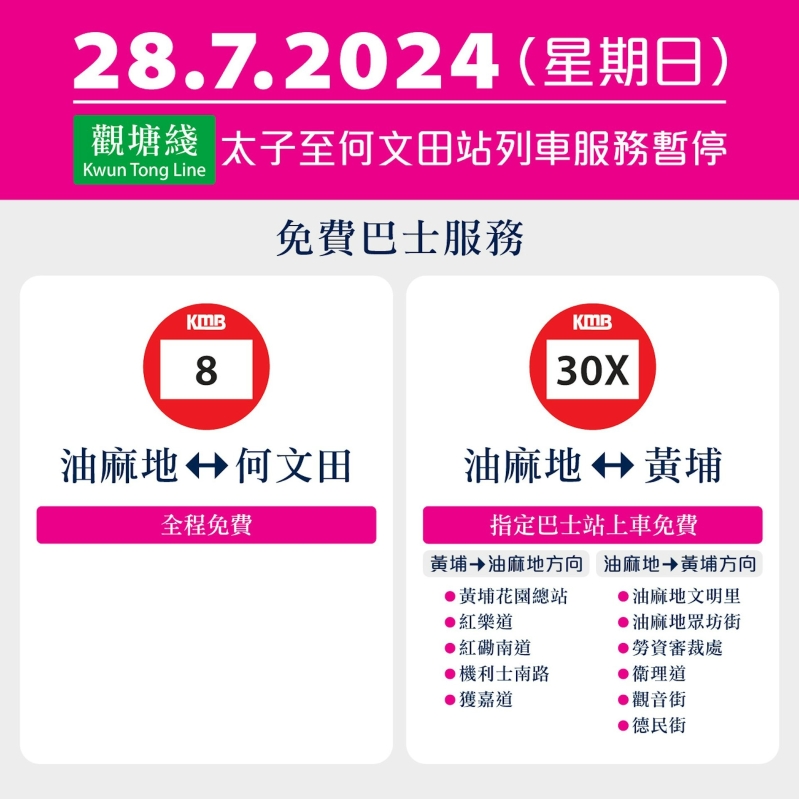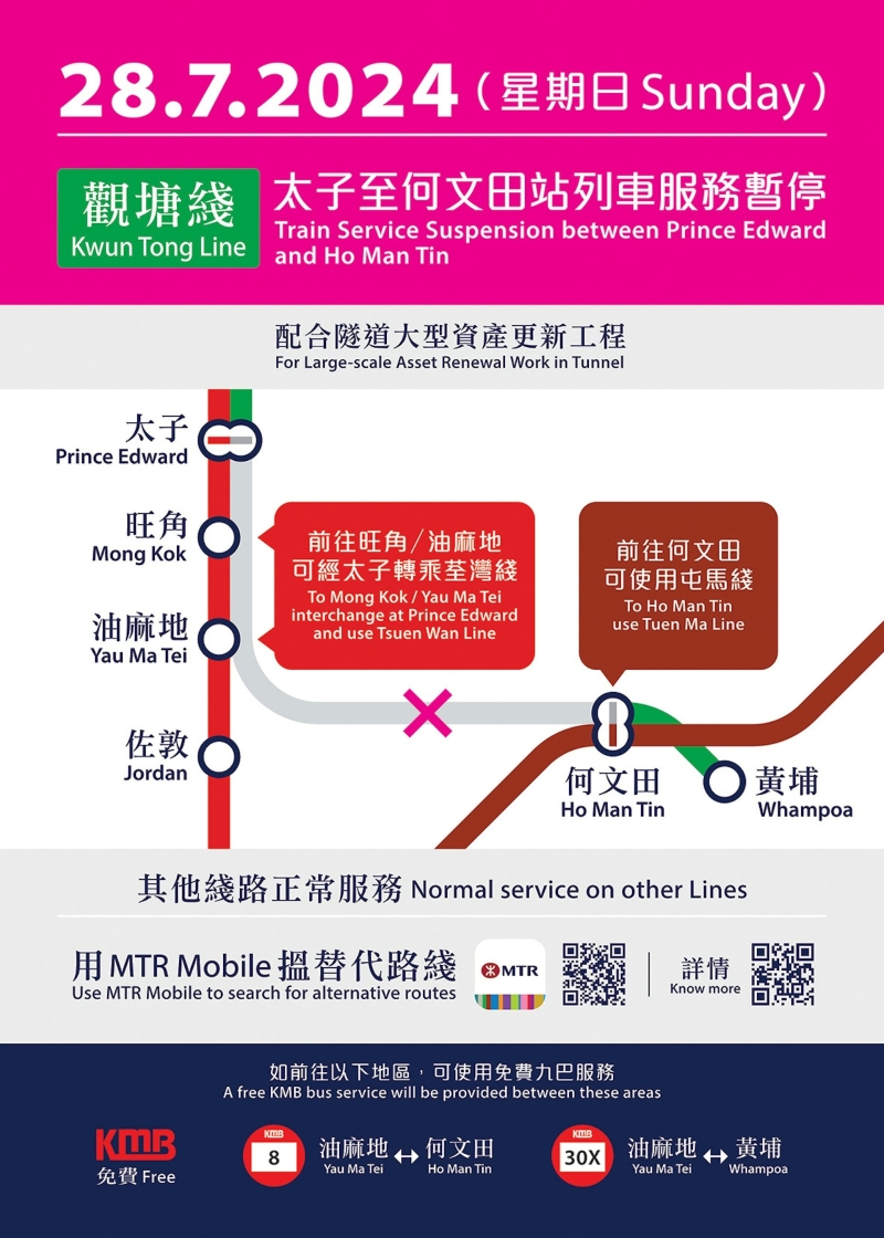 港鐵工程人員7月28日凌晨正展開觀塘綫隧道大型基建設施更新工程。港鐵圖 為了配合工程,今日(28日)觀塘綫來往太子至何文田站的列車服務將暫停,觀塘綫只會行走調景嶺至太子站,以及何文田至黃埔站路段。 港鐵提醒乘客,所有車站及其他鐵路綫照常服務,乘客仍可乘搭鐵路,穿梭各綫前往所有港鐵站,包括使用荃灣綫前往旺角及油麻地站,以及乘搭屯馬綫前往何文田站,當中太子站今日是荃灣綫和觀塘綫的唯一轉車站,預計太子站會非常繁忙。 港鐵再次呼籲乘客,出門前請使用MTR Mobile的“行程指南”功能規劃行程,並盡量使用太子站以外的其他轉車站及替代鐵路綫,包括乘搭東鐵綫、東湧綫及將軍澳綫過海。
