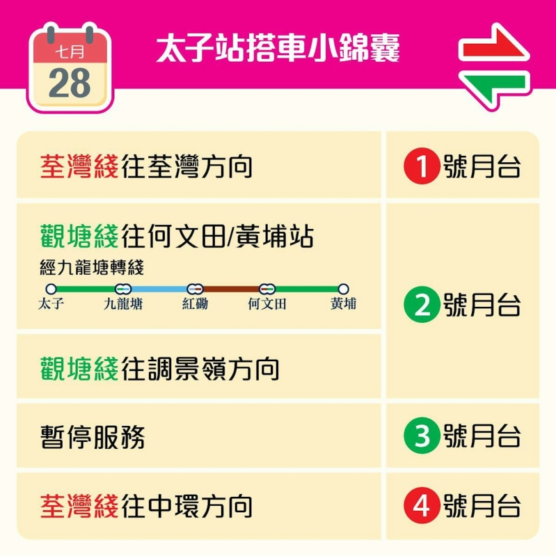 為了確保車站運作安全有序,太子站會實施人流管理措施,所有觀塘綫的乘客均使用 2 號月台上落車,請乘客留意站內指示,乘搭荃灣綫的乘客需留意“紅色”指示,乘搭觀塘綫的乘客則留意“綠色”指示,以便前往相應的月台,除了太子站之外,其他受影響車站的相關月台亦會暫時關閉,乘客可以留意站內指示。 就今日(28日)觀塘綫服務調整,太子站及相關車站已增加特別標示及指示牌,港鐵職員亦會在場協助乘客。港鐵表示,會密切留意實際情況,適時調整列車服務以配合車站運作及乘客出行需要,港鐵公司感謝乘客體諒及配合。(完)