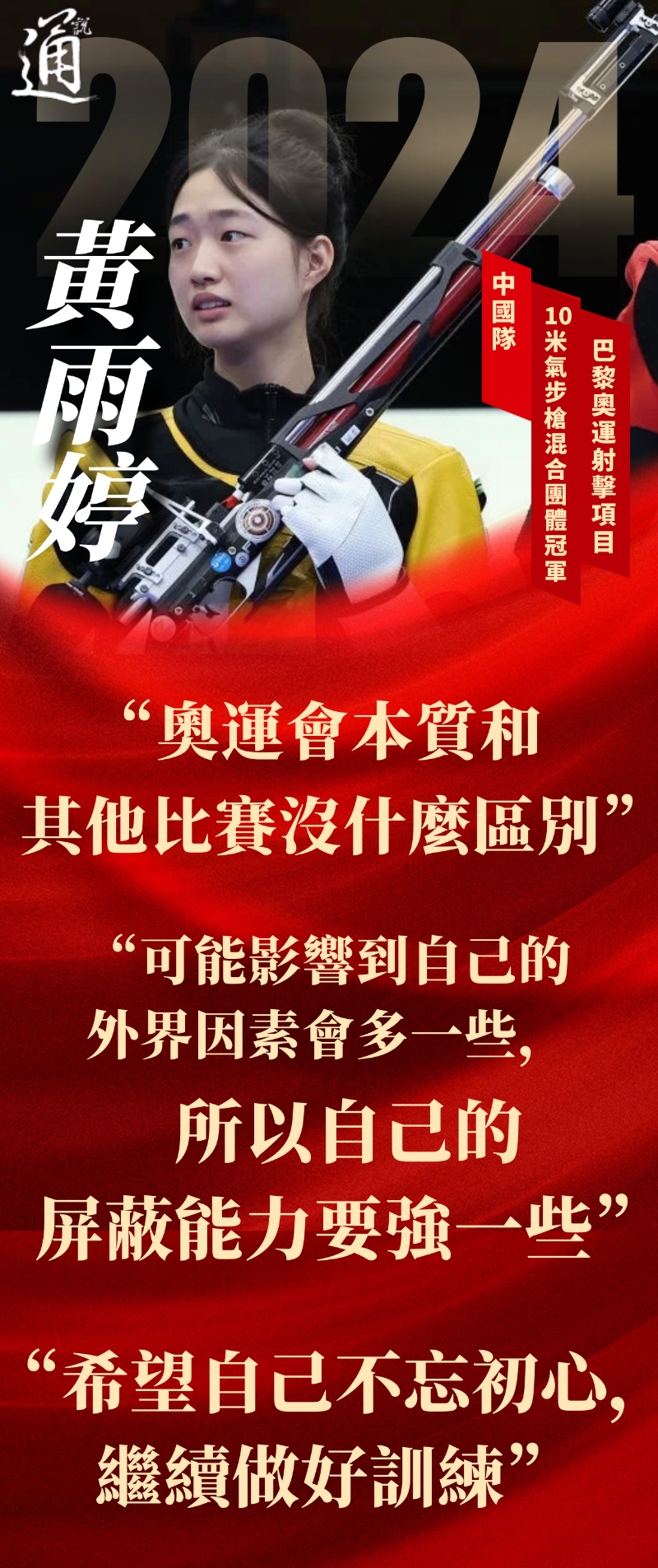(香港中通社圖片) 被問到由落後1:7追到10:10,當時在想什麼,江旻憓說:“我不想輸得那樣肉酸,沒打出香港精神就輸,這場比賽舞台,這個皇宮這麽靚,所以想打得好看,對得住自己。” 當日的射擊項目10米氣步槍混合團體賽中,中國隊“00後”組合盛李豪/黃雨婷以16:12戰勝韓國組合朴是晙/金智賢,摘得冠軍。 黃雨婷在賽後表示,這場比賽整體來說表現比較正常,但也有可以提升的地方,比如心態。