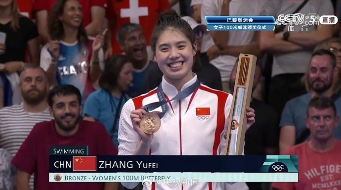 央視直播截圖。 張雨霏領獎後接受方力申的訪問,直言不太滿意自己的成績,但能夠站上奧運頒獎台已算心滿意足。張雨霏其後力爭衛冕200米蝶泳,表示壓力已減輕不少,輕裝上陣。 訪問尾聲,張雨霏感謝香港支持者,希望大家繼續關注中國隊的表現,她突然問方力申香港是否拿到首金,並祝賀香港隊。 7月28日凌晨,巴黎奧運會擊劍女子個人重劍金牌賽,中國香港運動員江旻憓奪得金牌,這是今屆奧運港隊首面金牌,是港隊女子重劍首金,也是港隊歷屆奧運以來第三金。 張雨霏在巴黎奧運女子100米蝶泳,以總成績第二名打入決賽,29日凌晨出戰決賽爭獎牌。張雨霏頭50米留守第二位,轉池後一度跌落第三名,其後返回第三,以56.21秒完成賽事,摘下銅牌,美國的哈絲嘉(Torri Huske)與禾舒(Gretchen Walsh)則奪得金﹑銀牌。張雨霏在上屆奧運100米蝶泳屈居亞軍,今屆未能如願奪金,她領獎時落淚。(完) 【編輯:徐嘉儀】