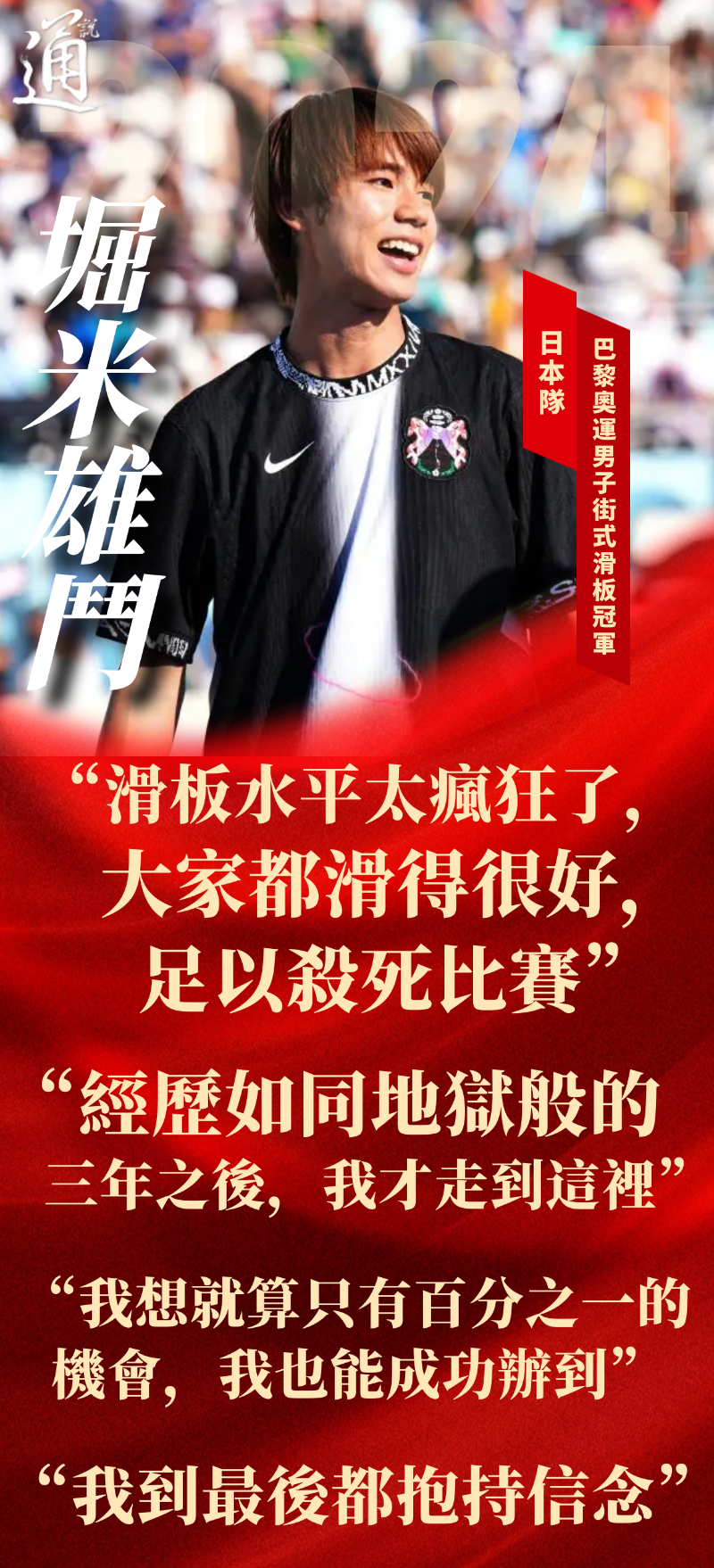 (香港新聞網製圖) 當日,在巴黎實現衛冕的還有來自日本、英國等國和地區的選手。 在滑板男子街式決賽中,日本選手堀米雄鬥在最後一個回合靠著關鍵大招,拿到97.08分的高分,一舉從排名第七直接衝上第一,最終以總分281.14分成功完成大逆轉,衛冕金牌。 成功登上最高領獎台的堀米雄鬥坦言這次難度不小,“滑板水平太瘋狂了,大家都滑得很好,足以殺死比賽。” 對於成功衛冕,他形容是如同經歷地獄般的三年才走到這裡,因此現在奪下這面金牌的情緒,比在東京奧運時更強烈。 “我想就算只有百分之一的機會,我也能成功辦到,我總是抱持著這樣的信念。”堀米雄鬥說。