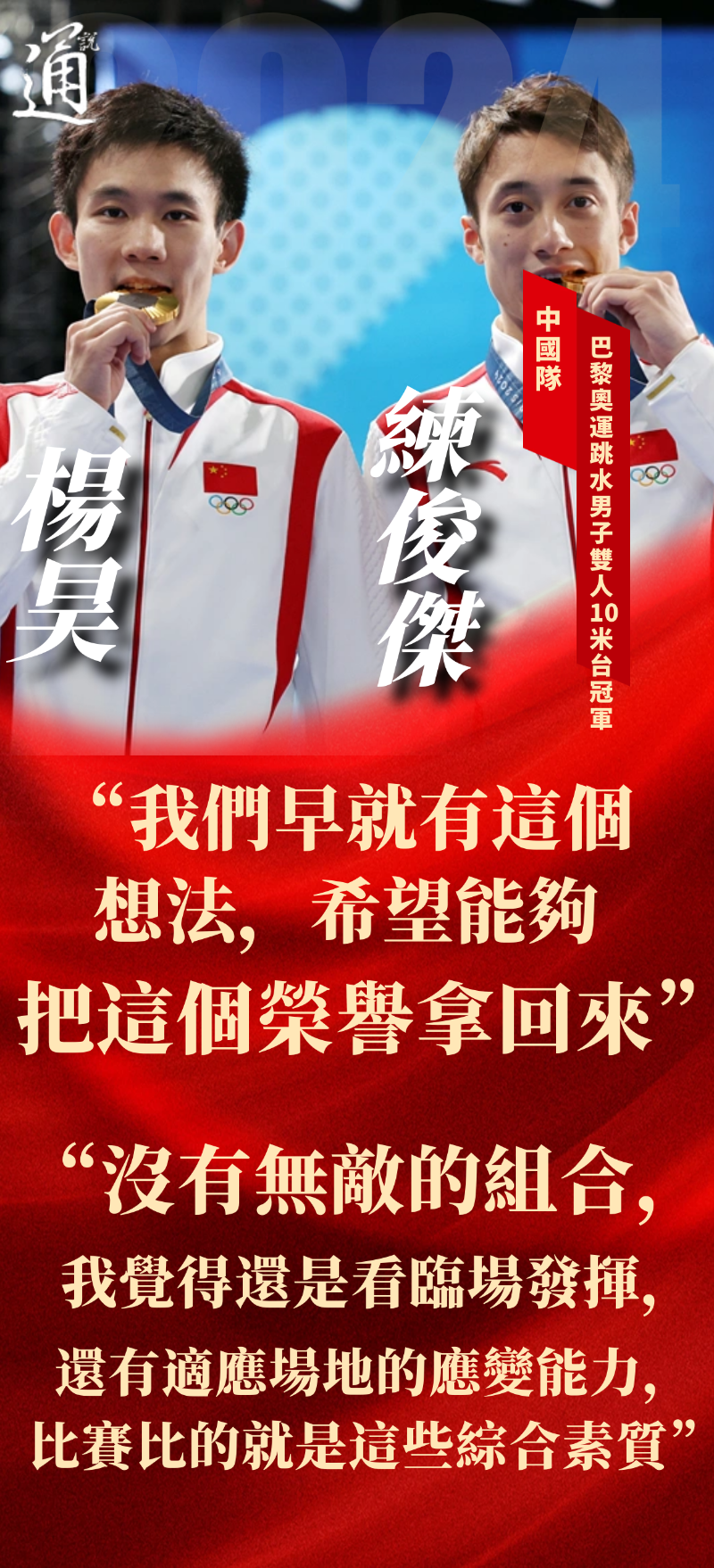 (香港新聞網製圖) 當日的巴黎賽場,亦有新兵為老將彌補遺憾。在男子雙人10米跳台跳水決賽中,首次參加奧運的中國隊組合練俊傑/楊昊,戰勝勁敵、英國組合戴利/威廉姆斯,如願將中國跳水“夢之隊”在東京奧運會上唯一丟失的金牌拿了回來。 在東京奧運會之前,中國隊在男子雙人10米台上取得了奧運四連冠。但3年前,英國組合戴利/馬蒂·李從中國跳水隊手中搶下了這枚金牌。因此,楊昊說, “我們早就有這個想法,希望能夠把這個榮譽拿回來。”