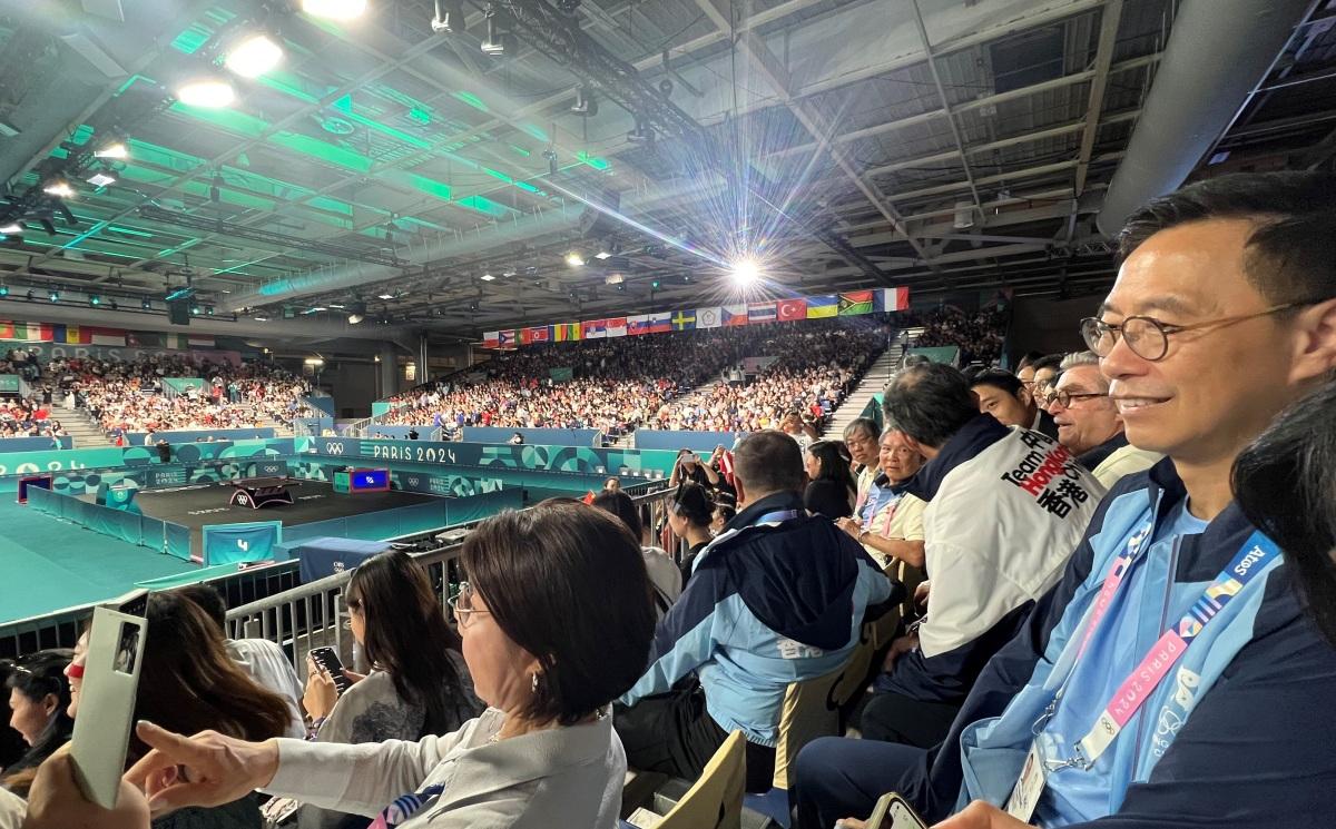 楊潤雄(右一)今日在巴黎觀看2024巴黎奧運乒乓球混合雙打賽銅牌戰及金牌戰。(政府新聞處) 楊潤雄亦在比賽現場祝賀國家隊在乒乓球混合雙打賽事取得金牌。 財政司司長陳茂波也在社交平台發文表示,成功打入四強的港隊乒乓混雙組合黃鎮廷、杜凱琹,於銅牌賽對戰韓國,即使面對對手凌厲的表現,黃杜仍然咬緊牙關、奮力激戰、瞓身打好每一球,雖然最終不敵,仍始終體現全力拚搏、不言放棄的香港精神。 陳茂波稱,鎮廷、凱琹今次以第四名完成乒乓混雙賽事,也是此項目港隊歷屆奧運最佳成績,令人鼓舞,希望他們繼續加油、再接再厲!國家隊混雙組合王楚欽、孫穎莎則在金牌賽,以4:2戰勝對手朝鮮,勇奪金牌,恭賀國家隊成功奪標! 港乒混雙上屆於八強失利,今次能夠晉級四強,已創下歷史佳績。 港隊於本屆奧運共參加4個乒乓球項目,除了混雙,女子團體16強賽將於8月5日開展對陣瑞典,如果順利晉級,會與巴西及韓國的勝方爭入四強。(完) 【編輯:紀東】