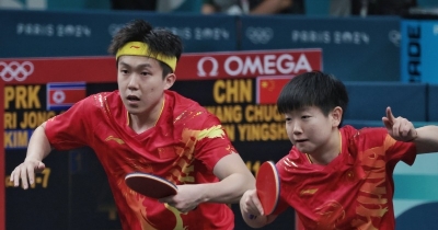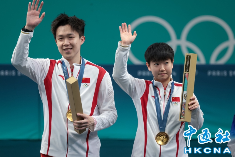 圖為頒獎儀式現場。(香港中通社記者 謝光磊 攝) 香港中通社圖片 當日決賽,面對首輪淘汰2號種子日本組合的“黑馬”搭檔李正植和金琴英,王楚欽和孫穎莎以11:6拔下頭籌。第二局7:7平後,朝鮮組合連得4分,11:7將大比分扳平。第三局,當王楚欽和孫穎莎9:8領先,中國隊請求了暫停,重新開賽後中國隊連取2分拿下。來到第四局,王楚欽和孫穎莎11:5輕鬆勝出。但此後頑強的朝鮮組合11:7再扳一局,雙方戰成大比分3: 2。第六局,王楚欽和孫穎莎一度5:7落後,但他們頂住壓力,最終11:8取勝,大比分4: 2拿下上屆奧運中國隊決賽憾失的混雙金牌。 賽後,王楚欽表示:“混雙太不容易了,這一塊混雙(金牌)積在我心里太久了。就像我在打這一屆奧運會之前說的,我想用生命去換回這塊金牌,我做到了!”乒乓球混雙上屆奧運才被列為正式奧運項目,這也是中國乒乓球隊第一塊奧運混雙金牌。 孫穎莎則說:“我們做到了!雙方都發揮得非常好,我們靠著信念,靠著堅韌的意志,最後贏了下來。” 朝鮮這對“00後”組合李正植和金琴英也以他們高超的技術、沉穩的比賽心態贏得尊敬。尤其是個子不高的女選手金琴英,她左手橫板,擅長當今混雙賽場少見的反手長膠,回球攻勢凌厲兇狠,與她可愛的外表形成“反差萌”。
