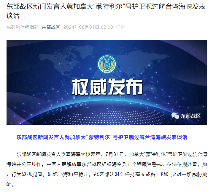 香港新聞網8月1日電 7月31日,加拿大“蒙特利爾”號護衛艦過航台灣海峽,中國東部戰區回應稱,中方全程跟監警戒,保持高度戒備。