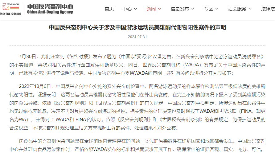 中國反興奮劑中心網站截圖 7月30日,我們注意到《紐約時報》發佈了題為《中國以“受污染”漢堡為由,在新興奮劑爭端中為游泳運動員洗脫罪名》的不實報道,再次對相關案件進行歪曲解讀和斷章取義。同日,世界反興奮劑機構(WADA)發佈了關於中國污染案件的聲明,已就有關情況進行了說明與澄清。中國反興奮劑中心支持WADA的聲明,并對有關問題進行公開回應如下: 2022年10月6日,中國反興奮劑中心實施的賽外興奮劑檢查中,兩名游泳運動員的樣本尿樣檢測結果呈極低濃度的美雄酮代謝物陽性。證據表明,這兩名運動員美雄酮代謝物陽性是他們在外出就餐時,在完全不知情的情況下攝入了受到美雄酮污染的肉食品導致。依照《反興奮劑規則》和《世界反興奮劑條例》的有關規定,中國反興奮劑中心判定:所涉運動員在此案件中均無過錯或無疏忽,決定不再對其提起興奮劑違規的指控。相關案件的處理決定也及時通報了WADA和世界泳聯(FINA,現更名為WA),并得到了 WADA和 FINA 的認可。依照《反興奮劑規則》和《世界反興奮劑條例》的有關規定,為保護運動員的合法權益,不按興奮劑違規處理且相關方未提起上訴的案件,處理結果不對外公佈。 肉食品中的興奮劑污染問題是在全球範圍內普遍存在的問題,類似的污染案件在許多國家和地區都會發生。中國反興奮劑中心在處理肉食品污染案件時,嚴格依照WADA發佈的標準和指南要求開展工作,確保案件的證據客觀、真實、充分、可信。與此形成鮮明對比的是,在近期發生的美國田徑運動員埃里揚·奈頓(Erriyon Knighton)興奮劑檢測結果呈類固醇(群勃龍)陽性的案件中,美國反興奮劑機構(USADA)在巴黎奧運會國內預選賽開始前突然作出決定,宣稱奈頓的陽性結果是由運動員食用了受污染的肉類引起的,決定不對其實施禁賽處罰,并允許他最終代表美國參加巴黎奧運會。相關研究表明,群勃龍是一種蛋白同化製劑,具有極強的提升力量和爆發力的作用,并不是常見的污染物質。近年來,全球發生了數以百計的群勃龍陽性。據公開信息顯示,絕大多數陽性都是基於4年禁賽的標准予以處罰,僅三名美國運動員因主張食品污染而逃脫了處罰。WADA聲明其正在重新審查奈頓案,并保留向國際體育仲裁院(CAS)提起上訴的權利。 《紐約時報》執意將興奮劑問題政治化、工具化,并針對全球普遍存在的肉食品興奮劑污染問題頻繁炒作,其主要目的就是擾亂巴黎奧運會游泳比賽的秩序,影響中國運動員心理并削弱其競技能力,這是極不公平、不道德的。該媒體所發佈的不實報道誤導了公眾對反興奮劑工作的認知,嚴重損害了世界游泳運動員對巴黎奧運會乾淨泳池的信心。對此我們表示強烈譴責和堅決反對。 我們強烈呼籲媒體朋友和反興奮劑同仁秉持實事求是的態度,客觀公正地看待和對待相關污染案件,公平對待因為食品或環境污染等原因無意攝入禁用物質的運動員,為維護運動員的合法權益和體育運動的公平競爭而努力。(完) 【編輯:丘志彬】