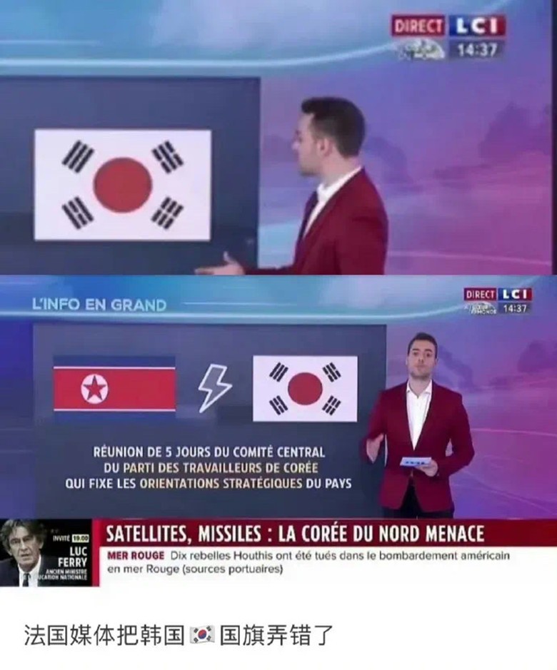 然而,沒有意外的話,又出意外了。 在法國媒體的又一檔奧運節目中,他們展示的韓國國旗照片,又錯了,這回變成了韓國和日本的國旗集合體了(見下圖)。