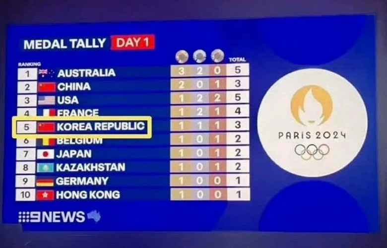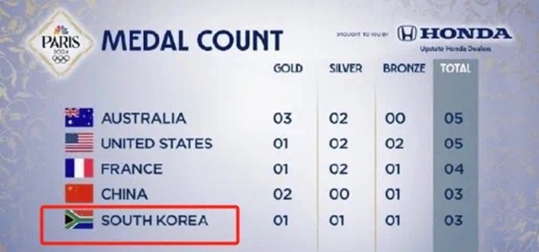 還沒等韓國網友們發怒,意外又來了! 7月27日巴黎奧運會首日金牌榜出爐之後,韓國高居第5名,韓國網友還沒高興3秒鐘,就赫然發現法國官方把韓國國旗標成了中國國旗......(見下圖)