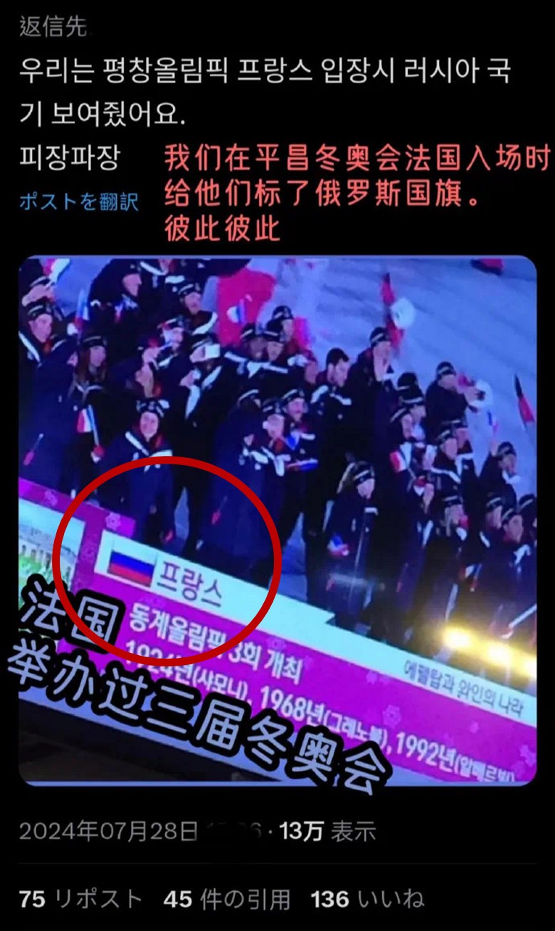 反正巴黎奧運才進行幾天,韓國和法國已經形成了固定程序:法國人不停地得罪韓國,然後韓國抗議,法國道歉。然後繼續得罪,抗議,道歉……得罪,抗議,道歉...... 此時就有韓國網友發問了:法國跟韓國到底有啥深仇大恨啊? 立刻就有法國網友回答:只因為法國人那該死的鬆弛感,請韓國網友不要拘泥這些小細節啦…… 然而,韓國網友們并沒有輕易放棄尋找原因,最終還真被他們找到了答案——2018年韓國平昌冬奧會的時候,韓國曾把法國國旗換成了俄羅斯的……(見下圖)(完)