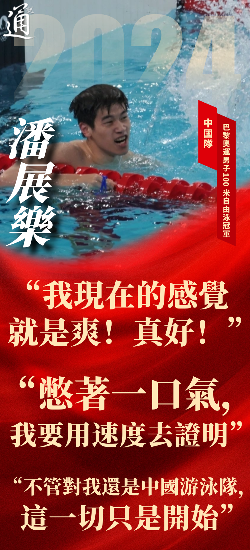 當地時間7月31日,在巴黎奧運會男子100米自由泳決賽中,中國選手潘展樂奪得金牌,并打破世界紀錄。(香港中通社記者 謝光磊 攝) 香港中通社圖片 31日,在游泳項目男子100米自由泳決賽中,中國選手潘展樂以46秒40的成績強勢奪金,並打破由自己保持的世界紀錄。 “我現在的感覺就是爽!真好!”奪金後的他如釋重負。 此次在巴黎,中國游泳隊經歷頗為艱難的時刻,過去整整四個比賽日,原本頗具實力的中國選手多次與金牌失之交臂,2銀2銅的戰績未能達到預期。用一枚金牌為中國泳軍掃卻陰霾的潘展樂坦言,憋著一口氣,“我要用速度去證明。” 當日站上奧運會的最高領獎台,潘展樂全程認真跟唱國歌。他說,“這一切都太奇妙了。我相信,不管對我還是中國游泳隊,這一切只是開始。” 當被問及頻繁的興奮劑檢查是否對備戰狀態造成影響時,這位“00後”選手自信且淡然,“測試在規定時間和規則以內,所以我不覺得有什麼,沒什麼大不了。”