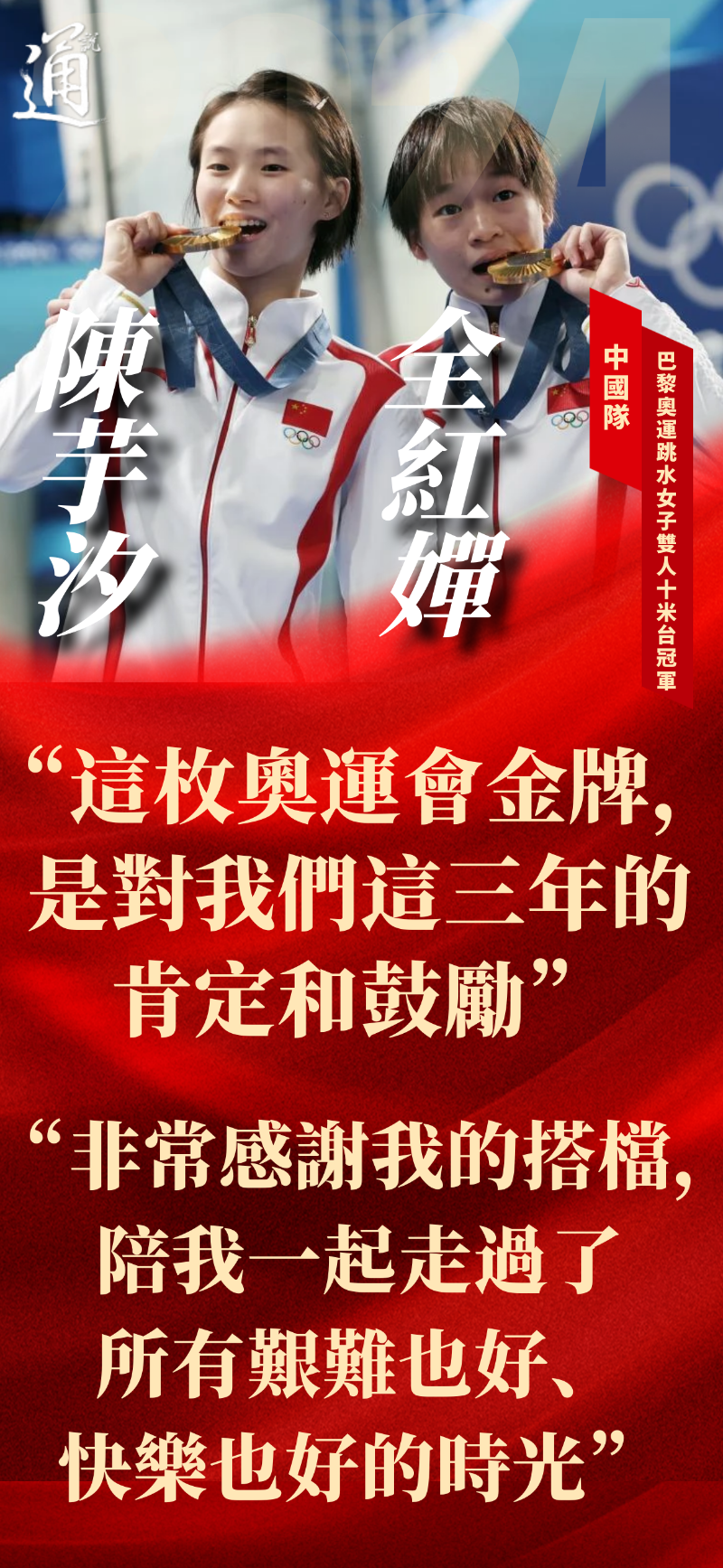 (香港新聞網製圖) 這一天在泳池,中國跳水隊亦以超強實力再次征服世界。31日,在巴黎奧運會跳水女子雙人十米台決賽中,陳芋汐/全紅嬋宛若“複製粘貼”,以絕對優勢摘得金牌。贏下比賽後,兩人還對著鏡頭頗有創意地做出一個“拿捏”的手勢。 奪冠之路看似輕鬆,可“水花消失術”的背後,進入巴黎奧運周期的她們都面臨了跳水女運動員一道大坎——發育關。骨骼和肌肉發育讓運動員的身高增高、體重增大,這意味著力量及耐力訓練都要相應調整。 全紅嬋的主管教練、奧運冠軍陳若琳曾說,全紅嬋幾乎每天都在因跳水動作207C(向後翻騰三周半抱膝)受折磨;陳芋汐則長期受到腰傷影響。 因此,陳芋汐在賽後感慨地說,非常感謝搭檔,陪自己一起走過“艱難也好、快樂也好的時光”,“這枚奧運會金牌,是對我們這三年的肯定和鼓勵。”