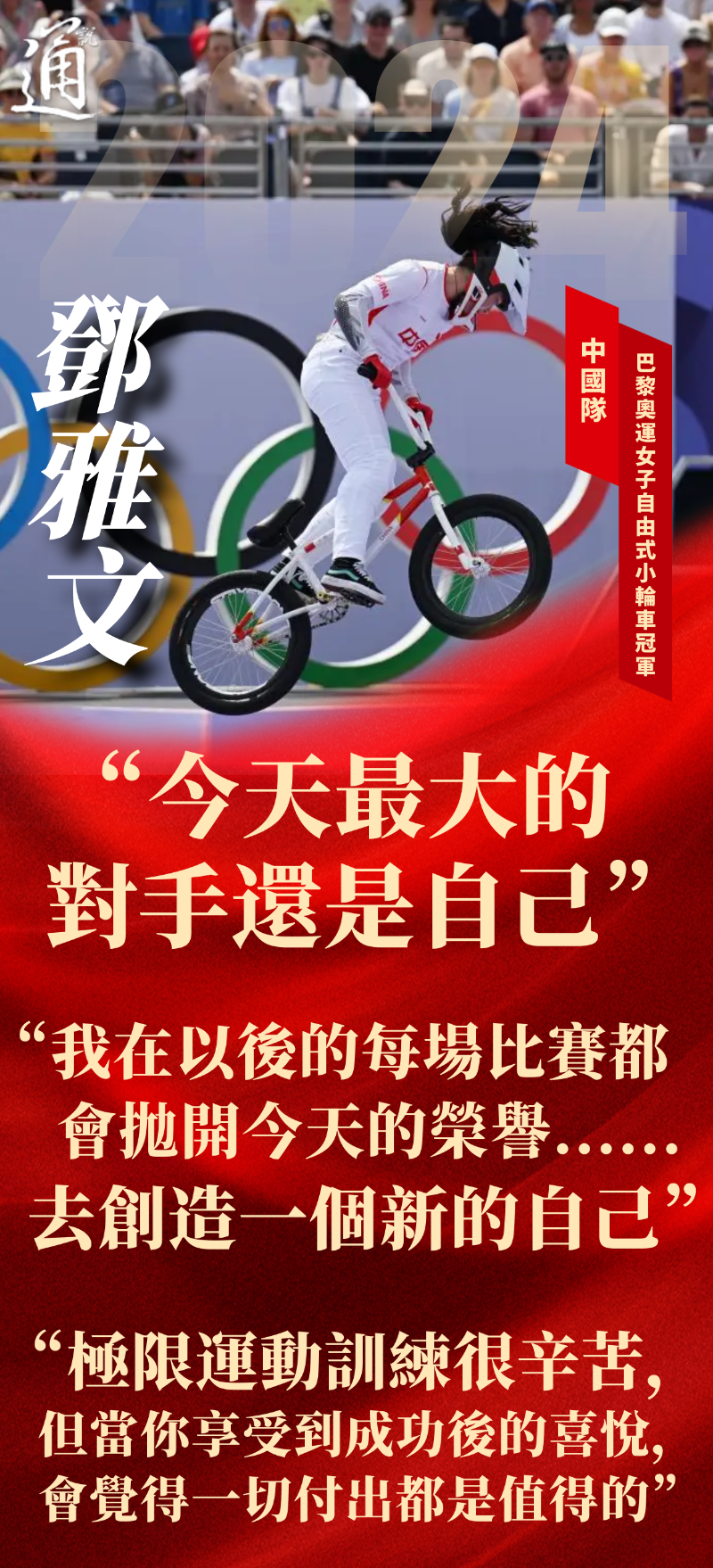 (香港新聞網製圖) 除了在傳統強項上奪金,中國隊在本屆奧運也迎來新項目上的歷史突破。鄧雅文在女子自由式小輪車公園賽決賽中,以92.60分的成績為中國隊拿下這枚奧運會歷史上的首枚金牌。 “今天最大的對手還是自己。我賽前就想著先把自己的事情做好,專注於自己的比賽。”鄧雅文表示,小輪車是一項極限運動,日常訓練非常辛苦,但最後享受到成功的喜悅時,會覺得一切付出都是值得的。 展望未來,她表示自己不能躺在功勞簿上,這枚金牌只能代表她最近一段時間的成功。“我在以後的每場比賽都會拋開今天的榮譽,我會重新做回比賽中最好的自己,去創造一個新的自己。”