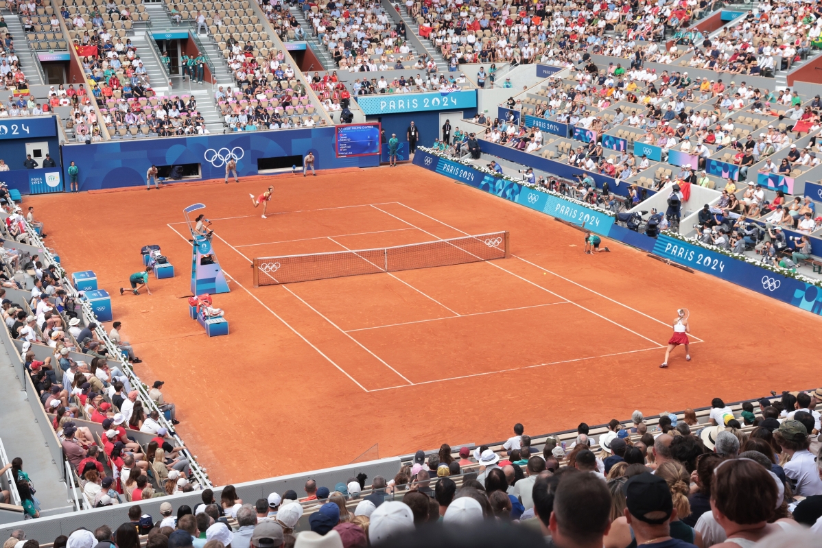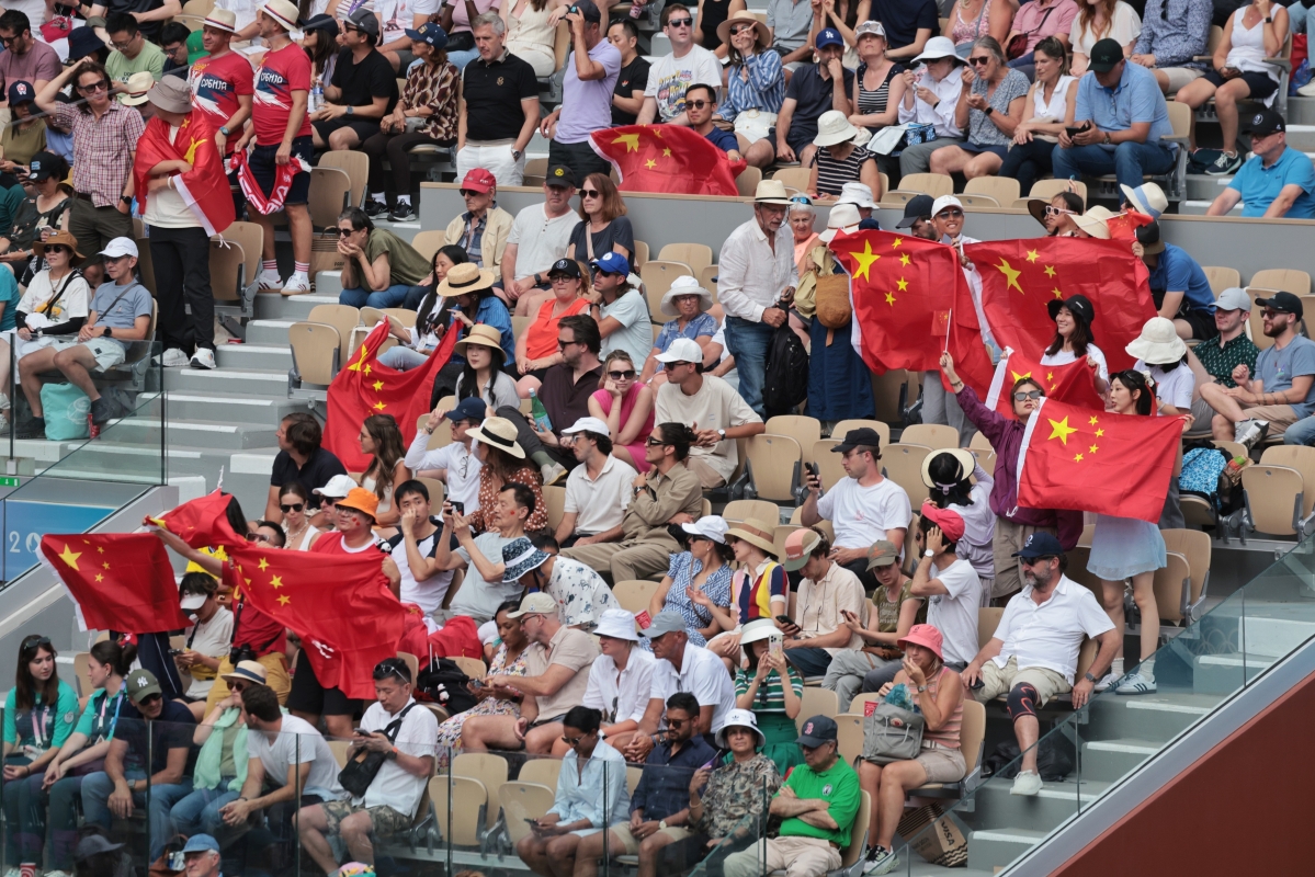 中國球迷在巴黎奧運會網球女子單打決賽上搖旗呐喊 【編輯:洪少葵】