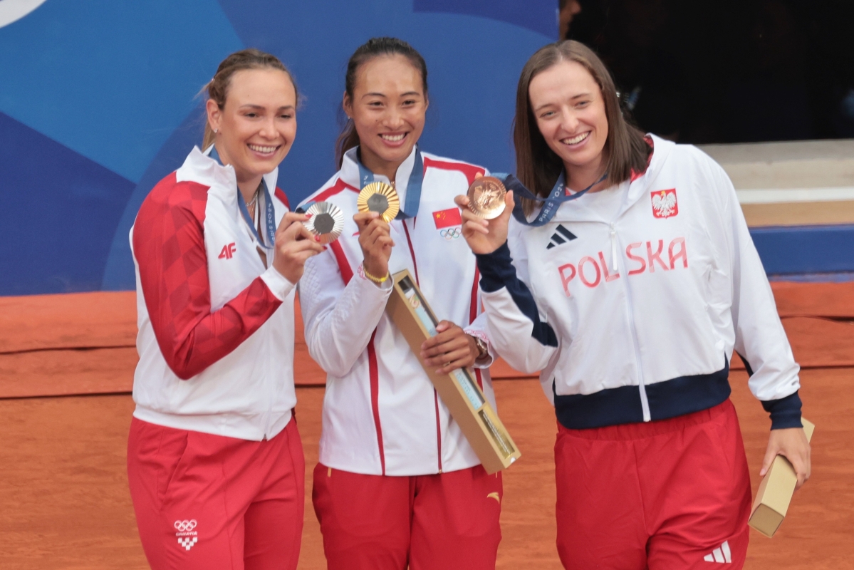在巴黎奧運會網球女子單打決賽中,鄭欽文(中)奪得金牌,實現了中國選手在該項目上的歷史性突破