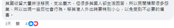 (香港新聞網製圖) “英國收留大量非法移民,支出龐大,” 有香港網友在評論區留言分析稱, “但很多英國人卻生活困苦,民間積聚很多怨氣,所以出現一些反社會行為。”提醒移英港人外出要特別小心,以免受到不必要的傷害。