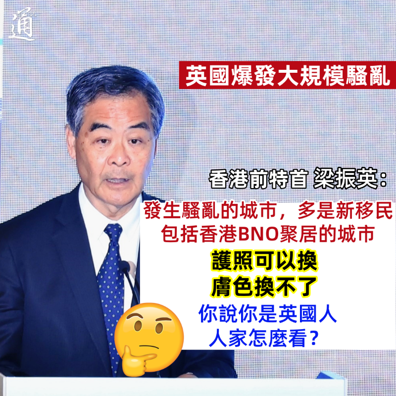 這場抗議浪潮源於一場兇案。7月29日,位於英格蘭西北部的南港發生持刀襲擊事件, 一名17歲男子持刀闖入一家兒童舞蹈班行兇,導致3名兒童死亡。事件震驚英國社會。 據路透社報道,在社交媒體上迅速傳播的虛假信息稱,持刀襲擊者是一名激進的移民,之後數百名反移民抗議者捲入騷亂。儘管英國警方已經表示,17歲的嫌疑人出生在英國,但反移民示威者的抗議活動仍在繼續,並演變成打砸、縱火和搶劫。 早前,英國推出BNO政策後,吸引部分港人移英。現時英國的這場騷亂,有否波及移英的港人? 協助在英國申請所謂“政治庇護”的香港人的組織“港援”近日在社交媒體發文稱,“如果你是香港籍尋求政治庇護者,居住政府提供的庇護住宿,但該住宿因示威或任何狀況而未能有效保護你的安全”,可以聯絡該組織求助。 據外媒報道,“港援”處理庇護住宿方面的負責人承認,收到3名住在庇護住宿的人於緊張氣氛下求助。 考慮英國騷亂中出現的搶掠,該負責人呼籲在英國的香港人關注事態發展。又說雖然暫時反移民示威者未攻擊香港人,但因應他們立場,擔憂他們未來可能針對香港人。 有移英港人接受傳媒訪問時亦說,會避免前往示威地區。“自己小心一些,如果你不去示威人群就可以。” 香港前特首梁振英則在社交平台發文點出, 發生騷亂的城市,多是新移民,包括香港BNO移民聚居的城市。他強調,護照可以換,膚色換不了。“你說你是英國人,人家怎麼看?” 梁振英也提到,去英國,住倫敦比較安全,因為有色人種多,但倫敦太貴。