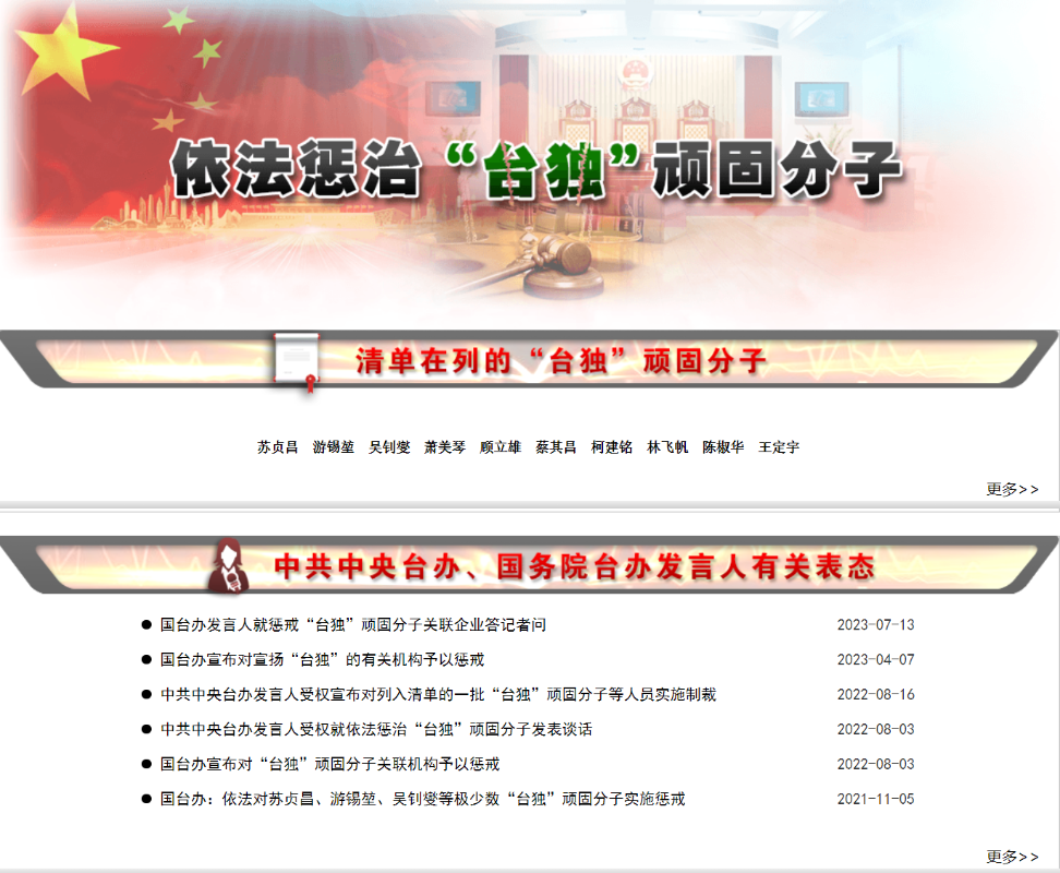 香港中通社8月7日電 (香港中通社記者 程敏璇)中國國務院台辦官方網站7日新增“依法懲治‘台獨’頑固分子”專欄,逐一列出蘇貞昌、游錫堃、吳釗燮等“台獨”分子名單。學者受訪表示,這是繼“懲獨22條”後懲處“台獨”分子舉措延續,也是對島內“台獨”頑固分子的震懾。 自6月21日,最高人民法院、最高人民檢察院、公安部、國家安全部、司法部聯合發佈《關於依法懲治“台獨”頑固分子分裂國家、煽動分裂國家犯罪的意見》後,國台辦官方網站7日新增“依法懲治‘台獨’頑固分子”專欄,五個板塊依序為:清單在列的“台獨”頑固分子,中共中央台辦、國務院發台辦發言人有關表態,法律文件,舉報清單在列的“台獨”頑固分子線索和罪行,舉報犯罪嚴重的新“台獨”頑固分子。中國公安部官網亦新增“懲獨”專欄。