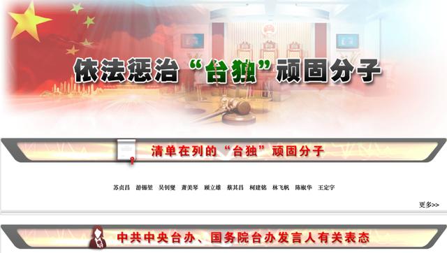 香港新聞網8月8日電 繼6月發佈懲治“台獨”意見後,國台辦官網8月7日新增一項“依法懲治‘台獨’頑固分子”的專欄,共設五個版塊。有台媒注意到,專欄將“台獨”二字用綠色字體加粗處理,配上五星紅旗和法庭背景圖,震懾意味濃厚。