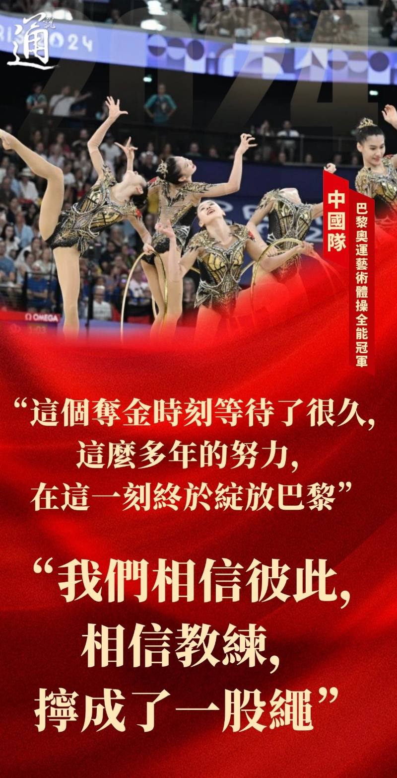 中國藝術體操的歷史亦在這天寫下新篇章。在10日落幕的藝術體操集體全能決賽中,由丁欣怡、郭崎琪、郝婷、黃張嘉洋和王瀾靜組成的中國隊拿下中國藝術體操隊史上首枚奧運會金牌。 一套呼籲環保的5人圈操《共生共舞》,以及一套極具中國風韵味的3人帶操+2人圈操《鳳鳴淩霄》,中國姑娘們用精準的動作和流暢的表演驚艶了世界,最終以69.800分的總成績奪冠。 “這不是奇跡,這是我們不斷訓練的結果。”賽後,五位姑娘的肺腑之言,點出了這枚突破性金牌的來之不易。 在混合採訪區,黃張嘉洋介紹,為感受不同的天氣和環境,隊伍來巴黎之前特意在中國多個省市轉訓,對困難有著較為充分的準備;隊長郭崎琪亦在賽後表示,全隊的準備工作做得非常細,因此上場時一點都不怯場,“我們相信彼此,相信教練,擰成了一股繩。” 對於摘金的結果,郭崎琪感歎:“這個時刻其實等待了很久,這麼多年的努力,在這一刻終於綻放巴黎。”