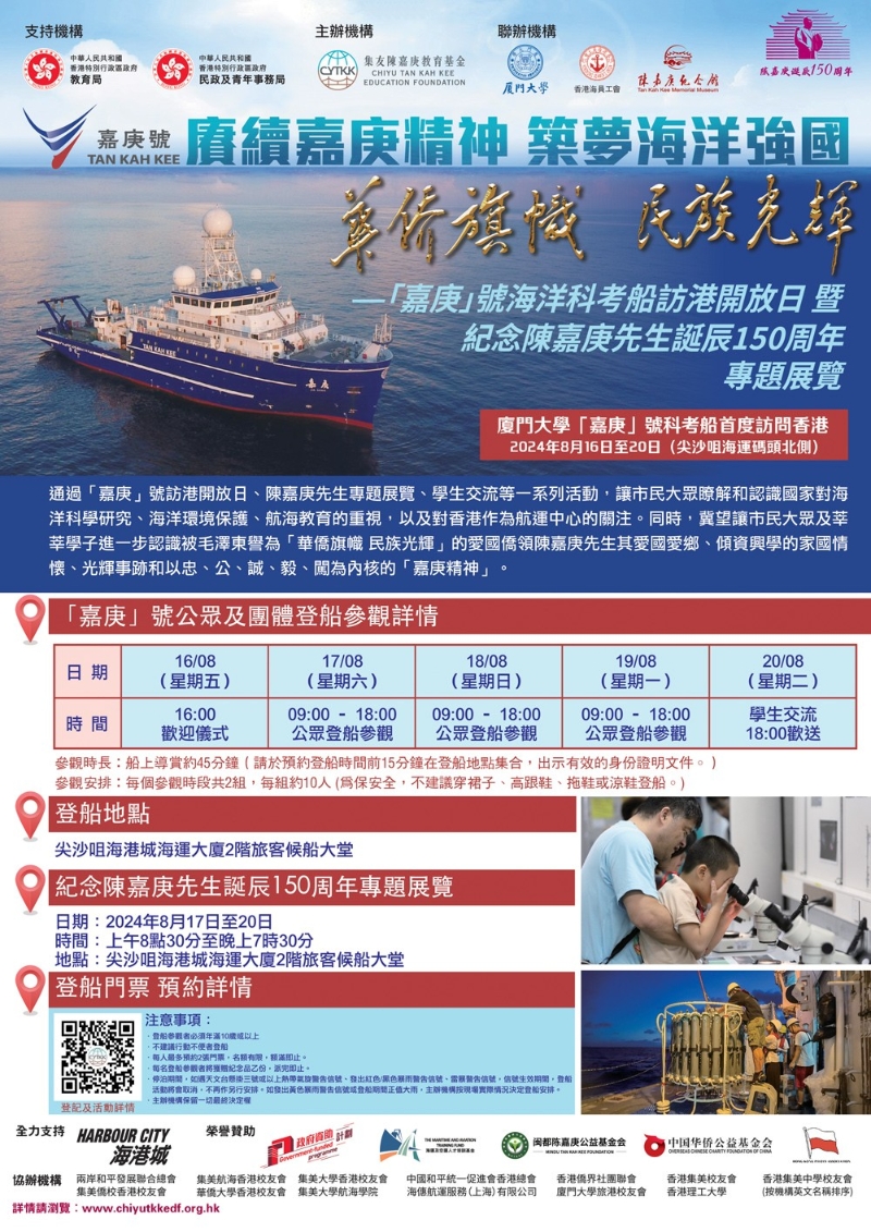 市民如有興趣登船參觀,可於8月1日早上11時起,透過https://chiyutkkedf.ievent.hk 網上平台作實名登記,先到先得,每人最多預約2張門票。由於碼頭屬於禁區,同行人士亦須於網上平台作實名登記。 此外,於8月16日至8月20日期間,在海運大廈碼頭候船大堂亦設有“紀念陳嘉庚先生誕辰150周年專題展覽”,展覽介紹陳嘉庚先生自強不息、不懈奮鬥的一生,以及他傾資興學、紓難救國、發展航海教育等光輝事跡,同場亦介紹“嘉庚”號的建造、運行等情況,以及香港航運業的發展及人才培養等,公眾可藉此機會多了解有關陳嘉庚先生的生平事跡及“嘉庚”號的資訊。 關於“嘉庚”號 為了緬懷廈門大學創辦人、著名愛國僑領陳嘉庚先生,廈門大學以“嘉庚”命名這艘海洋科考船。“嘉庚”號於2015年3月開工建造,2016年5月下水、命名,2017年4月正式交付使用。“嘉庚”號是一艘全球級、無限航區的3000噸級海洋科學綜合考察船,總長77.7米,型寬16.24米,設計吃水5.0米,總噸3611,續航力大於12500海裡,自持力大於50天,定員54名,可在全球所有無冰洋區開展海洋科學研究和教學實習。 登船參觀要求及注意事項 1. 嘉庚號海洋科考船訪港開放日 (2024年8月17日至19日) 2. 報名開始時間 : 2024年8月1日早上11時正 3. 報名截止時間 : 2024年8月16日晚上11時55分或額滿即止 4. 登船參觀名額有限,每人最多登記2張門票,不接受重覆申請; 5. 登船參觀者必須年滿10歲或以上,採取實名登記; 6. 成功登記的申請者將收到“預約確認書”電郵,郵件附有登船QR CODE; 7. 登船時必須出示登船QR CODE及有效身份證明文件,供辦理登船手續; 8. 登船參觀者必須在預約登船時間前15分鐘在登船地點集合 (九龍尖沙咀海港城海運大廈2階旅客候船大堂); 9. 請務必仔細閱讀“參觀要求及注意事項”,成功報名者視為已閱讀並同意遵守參觀要求及注意事項; 10. 基於安全考慮,不建議行動不便者登船參觀。(完) 【編輯:劉春】
