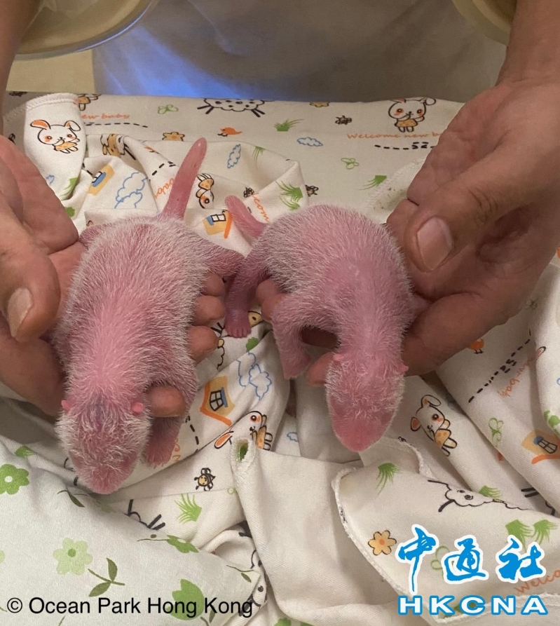 海洋公園大熊貓盈盈成功誕下一對龍鳳胎。(香港海洋公園供圖) 龐建貽說,“盈盈”目前很累,大部分時間要休息,希望慢慢恢復體力。他再次感謝中央和特區政府信任,將照顧大熊貓的重任交給海洋公園。更多大熊貓加入公園成為動物大使,將令公園保育、科研和教育工作做得更好。 海洋公園當天在社交平台發佈大熊貓龍鳳胎的照片。照片中,園內專家正用奶瓶給大熊貓寶寶餵食,一隻手就能拿起的大熊貓寶寶全身粉紅,身上長了一些白色細毛,十分軟萌可愛。海洋公園預料,龍鳳胎最快數個月後與公眾見面。 加上中央今年贈港的兩隻大熊貓,香港將有六隻大熊貓。特區政府文化體育及旅遊局局長楊潤雄當天赴四川落實中央贈港大熊貓的赴港安排,他返港後在機場見記者時確認,兩隻在香港出生的大熊貓會繼續留在香港,大家可以放心。 至於贈港大熊貓,楊潤雄指,牠們健康情況良好,預計9月底可運送到香港,並進行隔離及適應環境,估計12月與市民見面。(完) 【編輯:錢林霞】
