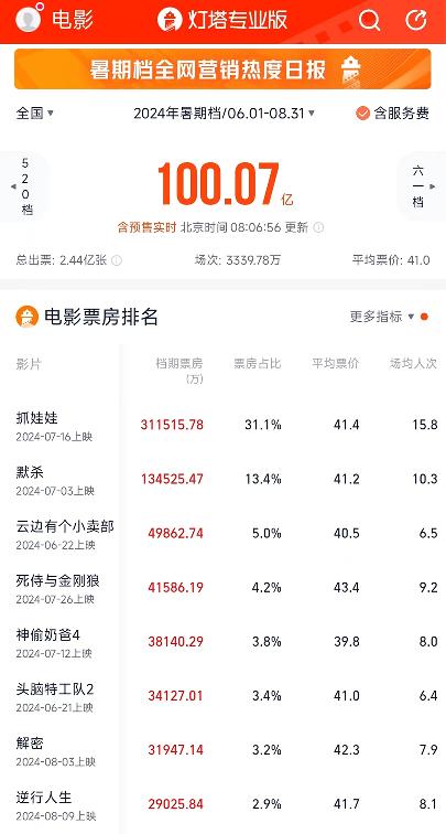 燈塔專業版截圖 據中央廣播電視總台報道,截至目前,今年暑期檔已有138部影片上映或定檔,已經基本持平去年暑期檔的最終上映的140部。燈塔專業版數據分析師陳晉介紹,暑期檔影片供給充足,題材類型也更多元化。 陳晉稱,包括劇情片48部,動畫片25部,紀錄片10部,喜劇片、動作片、犯罪片、愛情片都超過5部,在類型題材上更加豐富多樣,滿足了不同觀眾群體的需求,其中喜劇片票房接近50億表現最為出色。 以結構嚴整的類型化故事來觀照本土現實議題,暑期檔影片繼續探索類型叙事與現實題材的融合,力求在創作上達到喚起共鳴和共情的藝術效果。 《中國電影報》副總編輯張晉鋒表示,像《抓娃娃》《默殺》《逆行人生》等,不僅類型突出,還有扎實的現實基礎。比如《抓娃娃》影片當中所體現的孩子的教育問題,《默殺》當中體現在校園霸淩的社會問題以及《逆行人生》當中有一些中年危機等現實話題,更加容易引發廣泛關注和討論,幫助影片實現“破圈”。 根據觀影數據可以發現,動畫電影和愛情電影是目前比較受00後觀眾喜愛的兩種類型片。陳晉介紹,暑期檔中,24歲及以下觀眾占比止跌回暖,40歲及以上觀眾占比延續增長。 陳晉指,2024年暑期檔25歲以下年輕觀眾占比達到22.0%,小幅高於去年同期的21.3%,止住了連續多年快速下滑的趨勢,另外家庭觀影需求更顯著的40歲以上觀眾占比高達16.8%,明顯高於去年同期的15.3%,同時也延續了連續多年的增長勢頭。 據了解,巴黎奧運會期間,全國各地超800家影院通過轉播賽事實況的方式對乒乓球、羽毛球、跳水、排球、籃球、足球等多個項目的20場比賽進行直播,為廣大體育迷們提供一個體驗感更好、互動性更強的觀賽場景。 某票務平台相關負責人郭妮娜表示,累計放映接近2000多場,有將近5萬(人次)走進電影院,達到了接近200萬的票房,也是收穫了比較良好的市場反饋。 (完) 【編輯:紀東】
