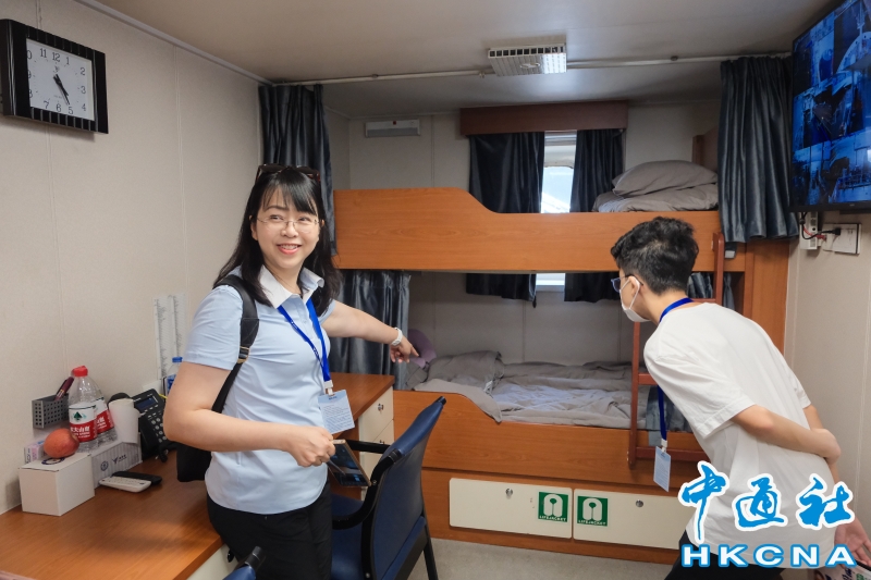 8月18日,香港市民參觀廈門大學海洋科考船“嘉庚”號的船員寢室。“嘉庚”號是中國第一艘採用國外方案設計、國內轉化詳細設計,並由船東擁有完全知識產權的海洋科學綜合考察船。“嘉庚”號船長77.7米,型寬16.24米,設計吃水5.3米,總噸3611,經濟航速11節,最大航速14節,續航力10000海里,自持力50天。“嘉庚”號於8月16日停泊香港,於8月17日至8月19日期間開放予公眾登船參觀,是第一艘在香港舉辦開放日活動的中國內地高校科考船。(香港中通社記者 許其皓攝) 香港中通社圖片