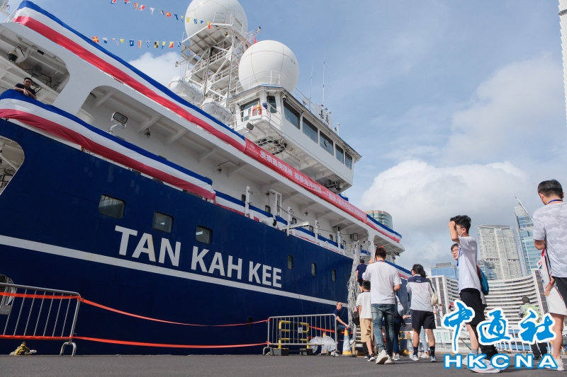 8月18日,香港市民參觀廈門大學海洋科考船“嘉庚”號。“嘉庚”號是中國第一艘採用國外方案設計、國內轉化詳細設計,並由船東擁有完全知識產權的海洋科學綜合考察船。“嘉庚”號船長77.7米,型寬16.24米,設計吃水5.3米,總噸3611,經濟航速11節,最大航速14節,續航力10000海里,自持力50天。“嘉庚”號於8月16日停泊香港,於8月17日至8月19日期間開放予公眾登船參觀,是第一艘在香港舉辦開放日活動的中國內地高校科考船。(香港中通社記者 許其皓攝) 香港中通社圖片