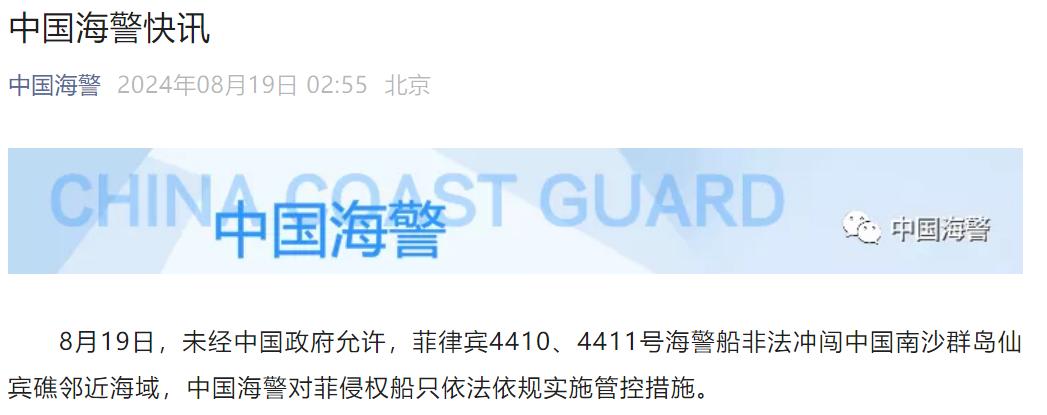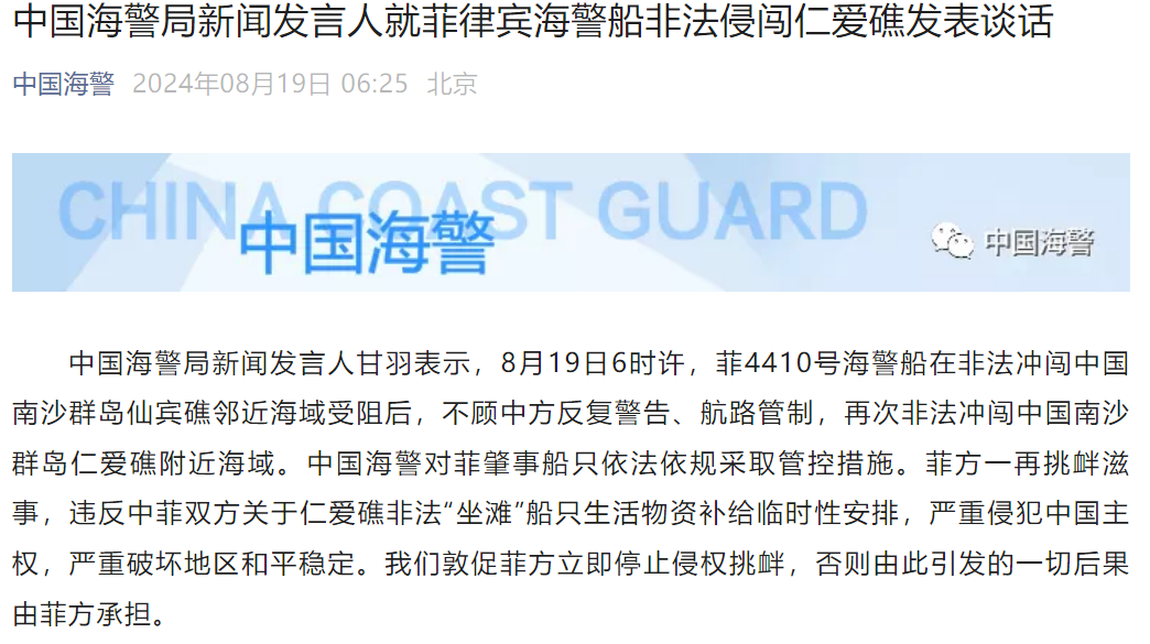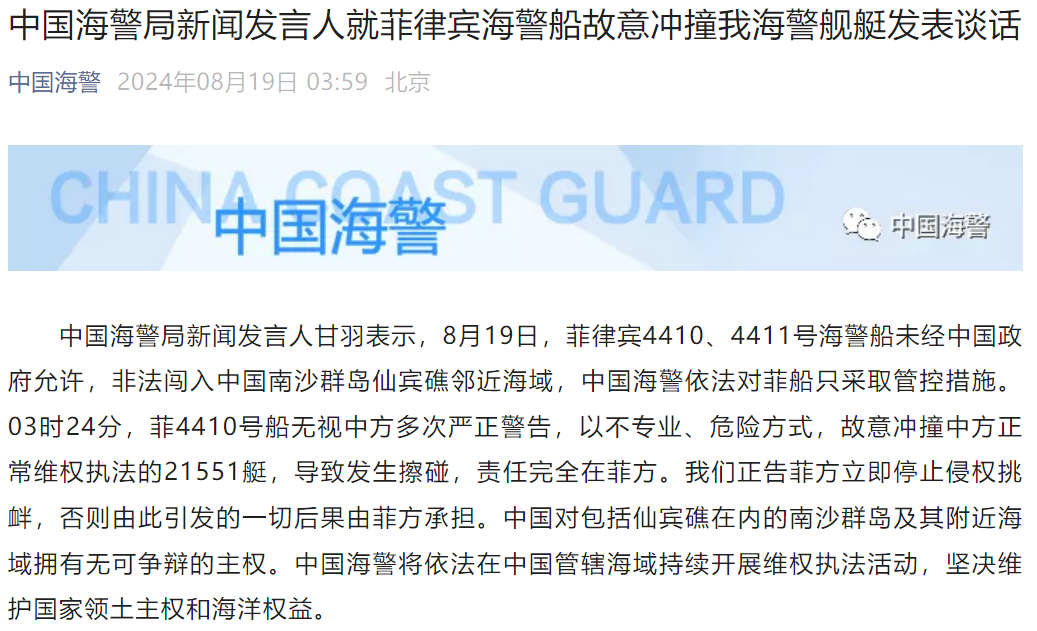 微信公眾號“中國海警”截圖 中國海警局新聞發言人甘羽表示,8月19日,菲律賓4410、4411號海警船未經中國政府允許,非法闖入中國南沙群島仙賓礁鄰近海域,中國海警依法對菲船隻採取管控措施。03時24分,菲4410號船無視中方多次嚴正警告,以不專業、危險方式,故意衝撞中方正常維權執法的21551艇,導致發生擦碰,責任完全在菲方。中方正告菲方立即停止侵權挑釁,否則由此引發的一切後果由菲方承擔。中國對包括仙賓礁在內的南沙群島及其附近海域擁有無可爭辯的主權。中國海警將依法在中國管轄海域持續開展維權執法活動,堅決維護國家領土主權和海洋權益。
