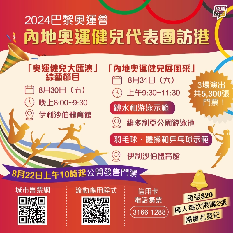 香港新聞網8月19日電 2024年巴黎奧運會內地奧運健兒代表團將於8月29日至31日訪港。行政長官李家超表示,過往國家隊運動員訪港均會掀起熱潮,為社會帶來熱鬧喜慶的氣氛,“我們熱切期待代表團到來,讓香港巿民可以一同分享國家隊取得驕人成績的喜悅,增強香港巿民尤其青少年的愛國熱情和民族精神。”特區政府還宣布,代表團訪港期間將出席3場公開活動與市民見面,包括奧運健兒大匯演綜藝節目和兩場內地奧運健兒展風采運動項目示範,想現場一睹奧運健兒風采的市民可於本周四(22日)上午10時起於城市售票網以實名制購票。 特區政府公布,代表團抵港後將展開一連三天訪問活動,包括出席由特區政府舉行的歡迎會和晚宴,亦會到訪香港體育學院,與香港運動員交流。訪港期間,奧運健兒將於30日晚上出席在伊利沙伯體育館舉行的奧運健兒大匯演。此外,奧運健兒亦會參與“內地奧運健兒展風采”項目示範活動,於8月31日上午兵分兩路,一路在伊利沙伯體育館示範羽毛球、體操和乒乓球,另一路於維多利亞公園游泳池表演跳水和游泳。代表團將於8月31日下午離開香港。 公開活動的門票本周四(22日)起公開發售(見附圖)。康樂及文化事務署昨日宣布,3場公開活動共有約5300張門票預留予公眾人士,當中已包括免費門票給弱勢社群。另外,大會亦會安排電視台轉播活動,方便市民在家中收看。 康文署又提醒所有入場者,由於售票採用實名制,進場需時核實個人資料,觀眾輪候進入有關場所的時間可能會較長。舉行有關活動的場所將在活動前一小時開放,表演前亦有前奏節目,署方建議市民提早到達,以免錯過精彩節目。