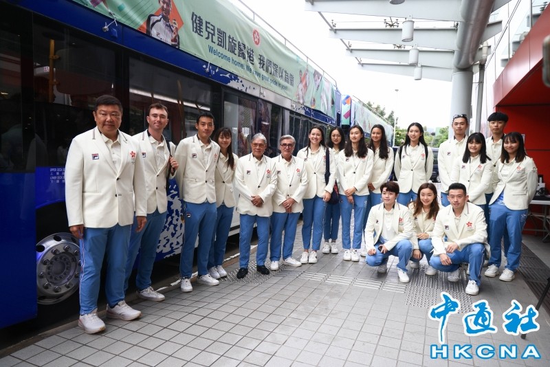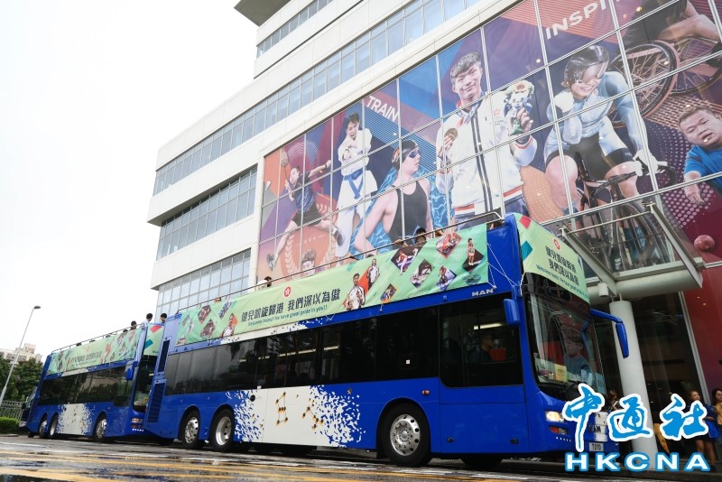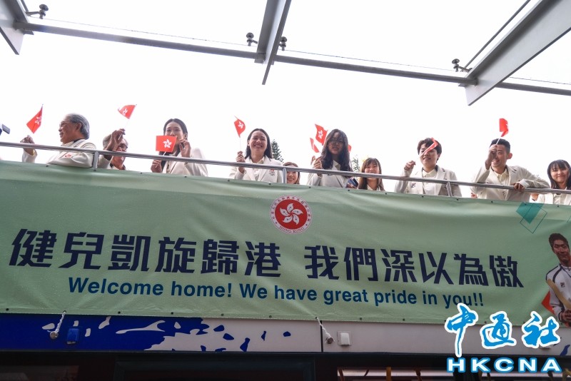 香港新聞網8月21日電 巴黎奧運中國香港代表團取得兩金兩銅,金牌數量歷屆最多,令人鼓舞。香港特區政府與港協暨奧委會今日(21日)為港隊代表團舉行巴士巡遊及歡迎儀式。參與的運動員、教練及代表團成員分別乘坐兩輛開篷巴士,由沙田前往添馬公園,沿途接受巿民祝賀。 兩部開篷巴士早上約10時許由沙田體院出發,乘坐的藍色巴士上掛著寫上“健兒凱旋歸港 我們深以為傲”的橫額。巴士途經大圍站,之後沿彌敦道駛至尖沙咀碼頭,大批巿民及遊客在場,有巿民歡呼並高喊加油。當巴士駛至尖東海傍,亦有巿民夾道歡迎,期間巴士減慢車速,方便運動員起身與巿民互動。
