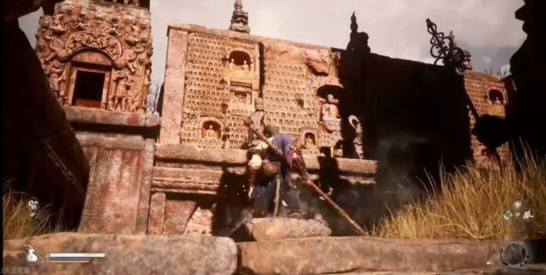 《黑神話:悟空》游戲里的雲岡石窟場景。圖自游戲畫面 雲岡石窟位於大同,在北魏時期開鑿,歷時150年而完成,是第一個皇家授權開鑿的石窟。其第一期工程最受重視,由僧人曇曜主持,被稱為曇曜五窟。五個石窟中間都雕刻了巨大的如來佛像,象征著北魏的五位皇帝。