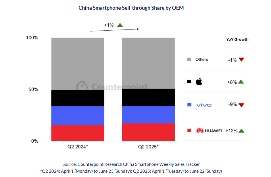香港新聞網7月4日電 調研機構Counterpoint Research發佈最新報告,在已經過去的2025年第二季度,中國手機市場的王者依然是華為,穩坐銷量之冠。同時,得益於iPhone 16系列促銷活動,尤其是iPhone 16 Pro和iPhone 16 Pro Max,蘋果5月份兩年來首次實現銷量增長。 根據 Counterpoint Research 最新的《中國智慧手機每周銷售跟蹤報告》的初步數據,預計2025年第二季度中國智能手機銷量同比略有上升,華為和蘋果引領增長,不過華為表現更優秀,將創下2025年第二季度中國市場主要品牌中最高的增長率,達到中國第一,同比增長或達12%。 蘋果 5 月份的銷量增長,得益於 iPhone 16 系列的促銷活動,尤其是 iPhone 16 Pro 和 iPhone 16 Pro Max。在評論蘋果第二季度的表現時,副董事齊安森表示:“蘋果在 5 月份調整 iPhone 價格的時機恰到好處,廣受好評,比 618 購物節提前一周。強勁的促銷活動與 5 月份的政府補貼計劃相吻合,促進了華為和蘋果的銷售。由於 iPhone 16 Pro 和 Pro Max 機型的強勁銷售,預計蘋果將出現高個位數增長。