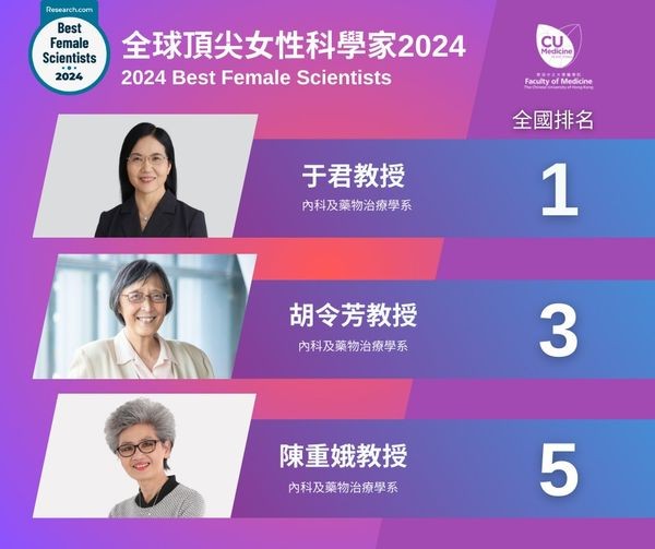 是次排名是透過嚴謹分析全球逾16萬名來自所有主要科學領域的研究人員,以學者或學科領域的H指數 (H-index) 及文獻計量指標評選出全球首1000名女性科學家。入選的三名中大醫學院教授均來自內科及藥物治療學系,包括于君教授、胡令芳教授及陳重娥教授。 “全球頂尖女性科學家”排名旨在為科學界建立傑出女性的典範,對她們的科研成就予以表揚和肯定,藉此鼓勵女性加入科研行列,並期望為女性科學家提供更多認同、發展和平等的機會。 (完) 【編輯:譚暢】