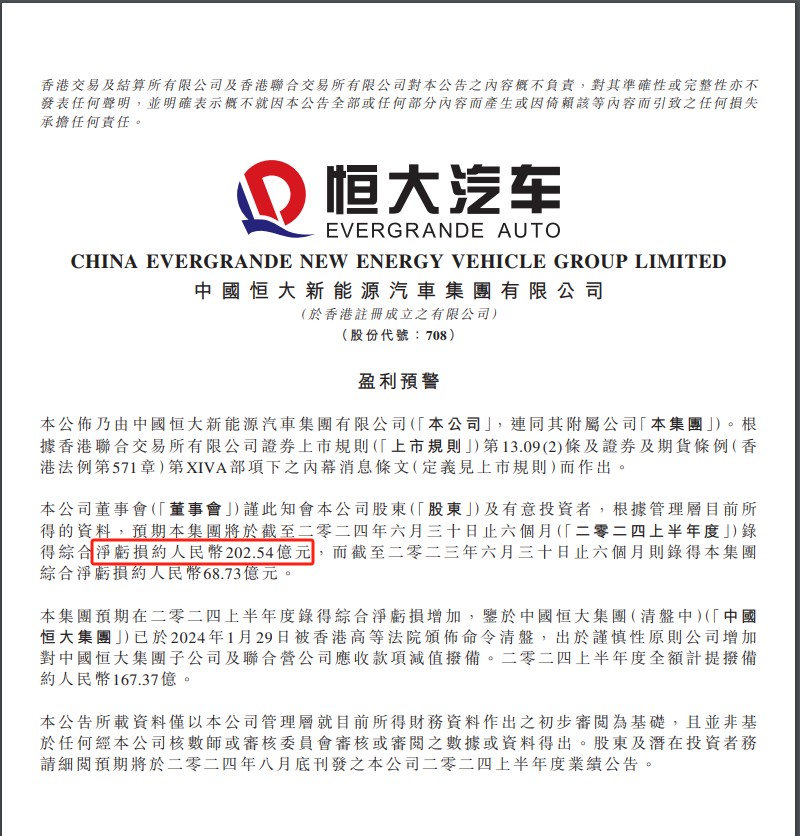 恒大汽車深夜公告。 恒大汽車稱,本集團預期在二零二四上半年度錄得綜合淨虧損增加,鑒於中國恒大集團已於2024年1月29日被香港高等法院頒佈命令清盤,出於謹慎性原則,公司增加對中國恒大集糰子公司及聯合營公司應收款項減值撥備。二零二四上半年度全額計提撥備約人民幣167.37億。 恒大汽車在公告表示:公告所載資料僅以本公司管理層就目前所得財務資料作出之初步審閱為基礎,且并非基於任何經本公司核數師或審核委員會審核或審閱之數據或資料得出。股東及潛在投資者務請細閱預期將於8月底刊發的上半年度業績公告。 在上半年虧損激增,破產重整以及退還相應補助的陰影叠加下,恒大汽車經營壓力重重。追溯恒大汽車這半年來的公告,此跡象早已顯現: 7月28日晚間,恒大汽車公告,其附屬公司恒大新能源汽車(廣東)有限公司及恒大智能汽車(廣東)有限公司於7月26日收到相關地方人民法院下發通知書,主要內容公告如下:相關附屬公司的個別債權人於7月25日向相關地方人民法院申請對相關附屬公司進行破產重整。 8月5日早間,恒大汽車公告,相關地方人民法院於8月2日就相關附屬公司破產重整進行聽證, 相關地方人民法院裁定相關附屬公司進入破產重整程序。 再往前,恒大汽車公告,因違約被要求向相關地方行政部門退回已發放的各項獎勵及補貼合計約人民幣19億元。 3月27日晚間,恒大汽車披露2023年財報。財報顯示,截至2023年12月31日,恒大汽車累計虧損已達1108.41億元。截至2023年年末,恒大汽車資產總額為348.51億元,負債總額725.43億元,其中,借款264.84億元。 (完) 【編輯:錢林霞】