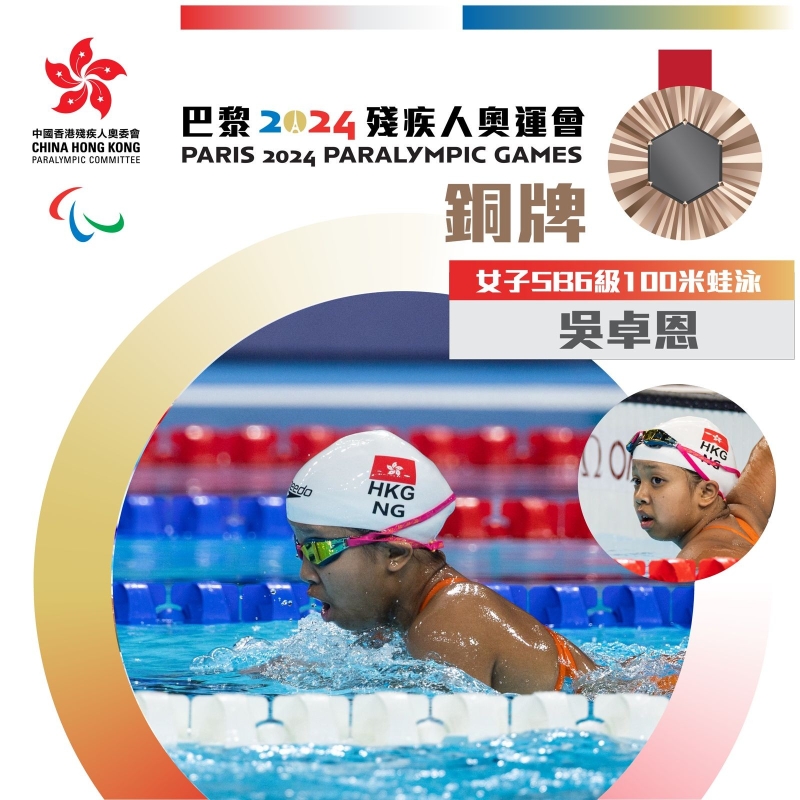 圖源:中國香港殘疾人奧委會FB。 李家超表示,吳卓恩是中國香港殘奧會代表團歷來年紀最小的運動員,她在比賽中展現了精湛泳術和堅毅鬥志,首次出戰殘奧會便創造佳績,勇奪銅牌,他和全港市民都為吳卓恩的出色表現感到驕傲。 吳卓恩近年表現優異,於杭州第四屆亞洲殘疾人運動會女子S6級100米背泳賽事奪得銅牌,更於去年在世界殘疾人游泳世界錦標賽女子SB6級100米蛙泳賽事奪得銀牌。 中國香港代表隊已在今屆殘奧會取得一銀、一銅共兩面獎牌。除吳卓恩剛獲得的銅牌外,還有陳睿琳在女子S14級100米蝶泳奪得的銀牌。(完) 【編輯:譚暢】