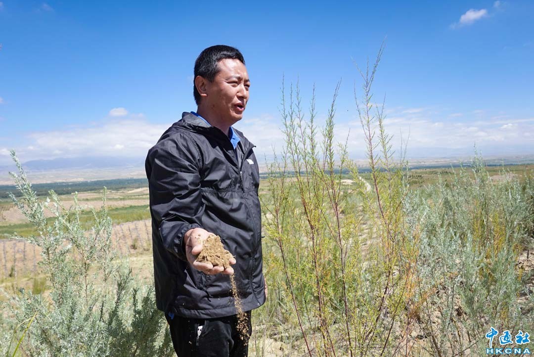 一株柳苗長20公分需要多久?在中國青海省海南自治州共和縣的沙珠玉鄉,時間需要一到兩年。香港中通社記者近日跟隨海外華文媒體團到此探究幾代人逾半世紀的戰“沙魔”探索。(香港中通社記者 陳卓儀攝)